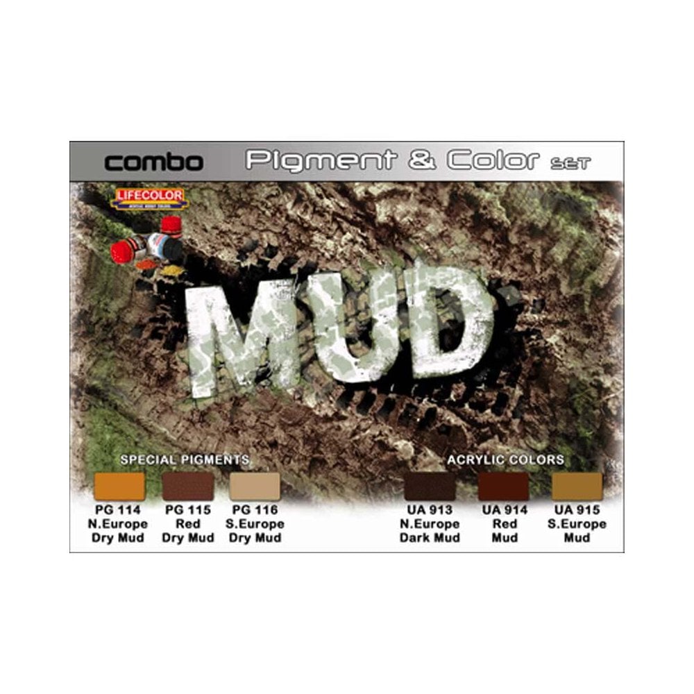 The LifeColor SPG05 Mud Set is designed to replicate realistic dry and wet mud effects on your scale models. It includes three earth-tone pigments and three matching glossy acrylic colours, allowing you to achieve convincing textures by mixing them together. The shades are specially formulated to represent mud conditions across different European regions.