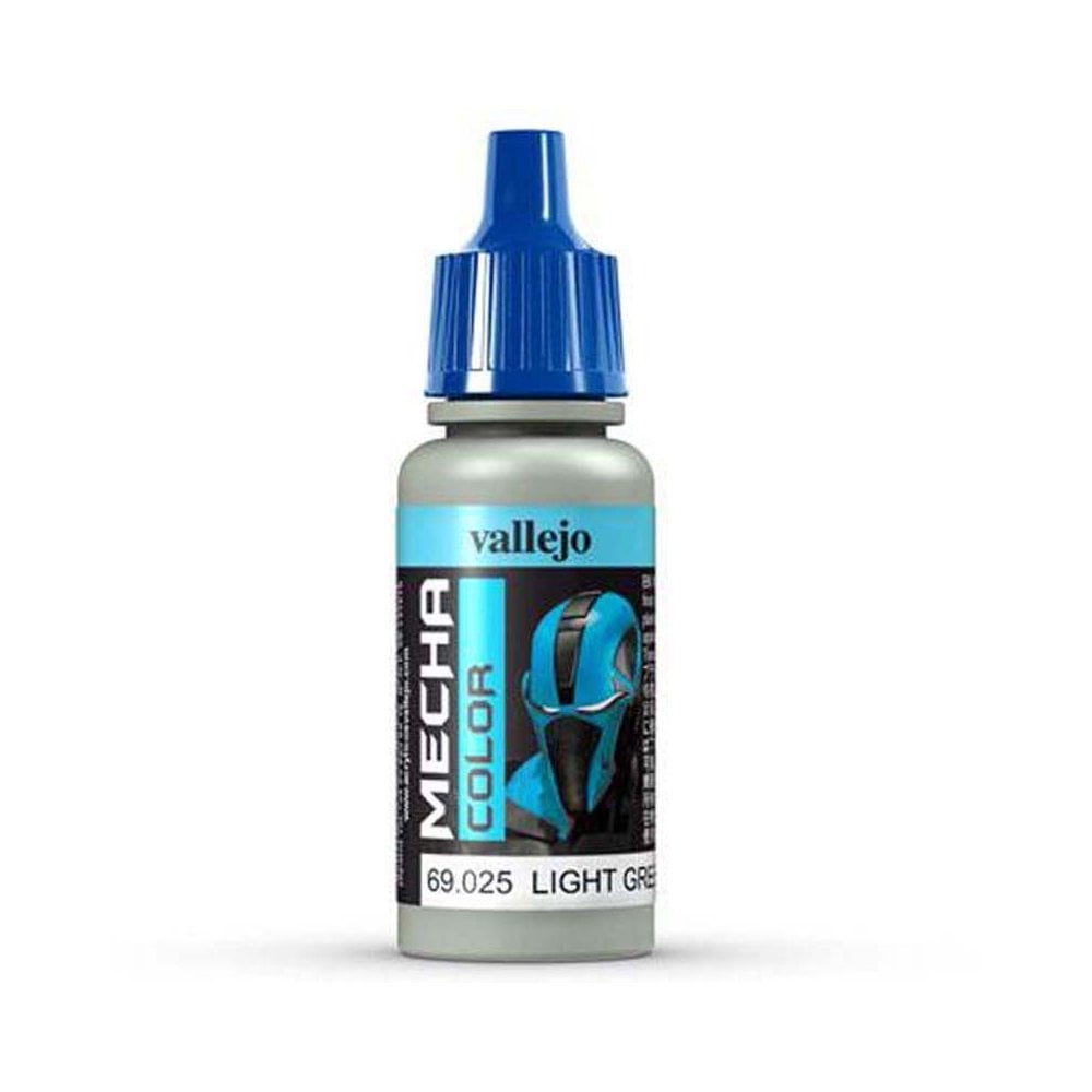 Light Green 69.025 Vallejo Mecha Color New formula acrylic colors with a satin finish, extra resistant and impact proof especially designed for airbrushing surfaces exposed to aggressive manipulation. The advanced formulation contains a revolutionary component which guarantees exceptional adherence on even the most difficult surfaces, and offers great resistance to rough handling, impact, friction, scratches, etc. Once dry, the Mecha surface looks the same as the original plastic of the model, while yet the smallest details of the original remain clearly visible. The color range includes primers as well as special varnishes ‚¨ also with an exclusive formulation- and a series of colors for aging and weathering effects. It is recommended to apply the Mecha colors in several layers on the previously primed surface; a few hours after application the colors will have dried to form a homogenous coating of extraordinary strength and resistance. Mecha Color can be airbrushed directly or diluted with Vallejo Airbrush Thinner or Flow Improver, and the colors can also be applied by brush. The compressor adjustment recommended is 15 ‚¨ 20 PSI o 0.5 to 1 kg. For best airbrush maintenance we recommend using the Vallejo Airbrush Cleaner.Safety: Mecha Color is not flammable, and does not contain solvents. Please see also certified safety information of the product on the Safety page.Packaging: Mecha Color is available in 17 ml./0.57 fl.oz. bottles (with eyedropper). Mecha Primer and Mecha Varnish are also available in 60 ml./2.02 fl.oz. and 200 ml./6.76 fl.oz. bottles (with flip top and eyedropper).