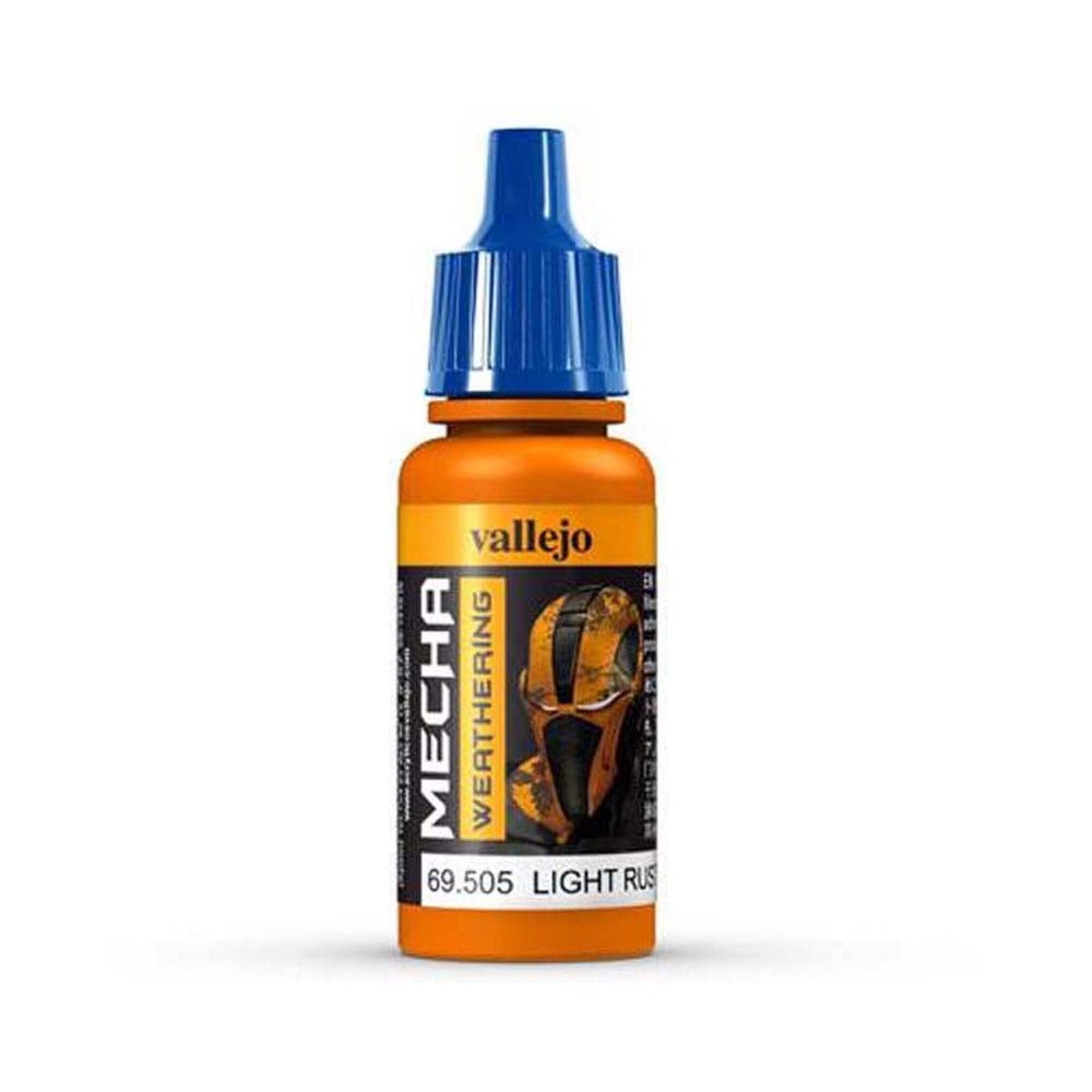 Light Rust Wash 69.505 Vallejo Mecha Color New formula acrylic colors with a satin finish, extra resistant and impact proof especially designed for airbrushing surfaces exposed to aggressive manipulation. The advanced formulation contains a revolutionary component which guarantees exceptional adherence on even the most difficult surfaces, and offers great resistance to rough handling, impact, friction, scratches, etc. Once dry, the Mecha surface looks the same as the original plastic of the model, while yet the smallest details of the original remain clearly visible. The color range includes primers as well as special varnishes ‚¨ also with an exclusive formulation- and a series of colors for aging and weathering effects. It is recommended to apply the Mecha colors in several layers on the previously primed surface; a few hours after application the colors will have dried to form a homogenous coating of extraordinary strength and resistance. Mecha Color can be airbrushed directly or diluted with Vallejo Airbrush Thinner or Flow Improver, and the colors can also be applied by brush. The compressor adjustment recommended is 15 ‚¨ 20 PSI o 0.5 to 1 kg. For best airbrush maintenance we recommend using the Vallejo Airbrush Cleaner.Safety: Mecha Color is not flammable, and does not contain solvents. Please see also certified safety information of the product on the Safety page.Packaging: Mecha Color is available in 17 ml./0.57 fl.oz. bottles (with eyedropper). Mecha Primer and Mecha Varnish are also available in 60 ml./2.02 fl.oz. and 200 ml./6.76 fl.oz. bottles (with flip top and eyedropper).
