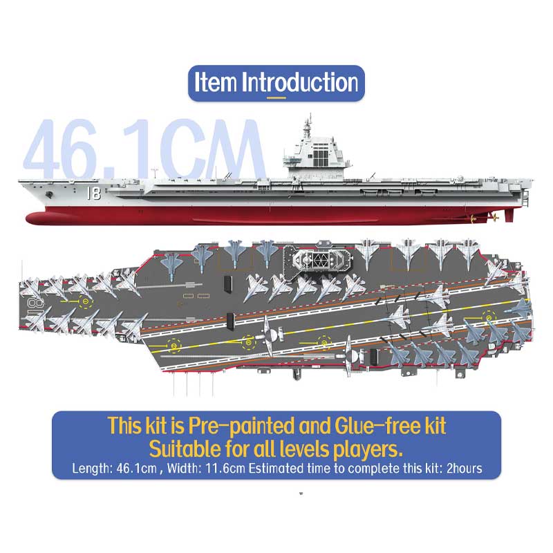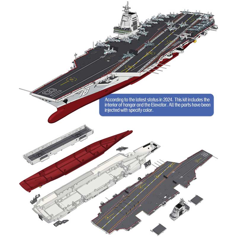 The Type 003 Fujian (CV-18) is the third aircraft carrier of the People’s Liberation Army Navy and the first of its class to feature an electromagnetic catapult launch system. Launched in 2022, it represents a significant leap in China’s carrier capabilities, enabling more efficient aircraft operations and supporting a diverse air wing. The Fujian’s design incorporates advanced radar, defensive systems, and a spacious flight deck, making it a formidable asset for power projection and maritime security. This model kit captures the scale and detail of the Fujian, allowing enthusiasts to showcase a centrepiece of modern Chinese naval engineering in miniature form.