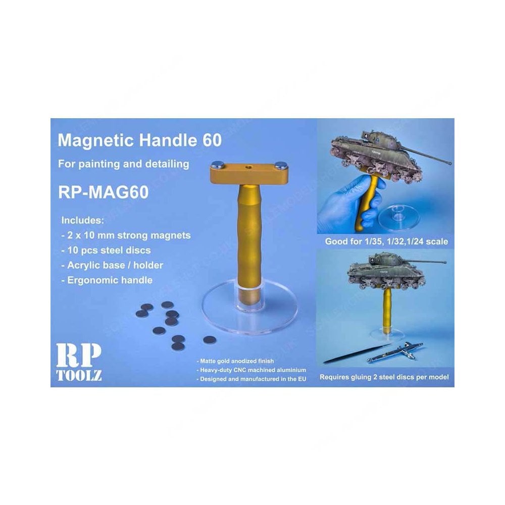The RP Toolz Magnetic Handle With Stand RP-MAG60 is designed for securely holding plastic models in place using strong magnets and steel discs. This setup provides stability and control during assembly, detailing, and painting tasks.
