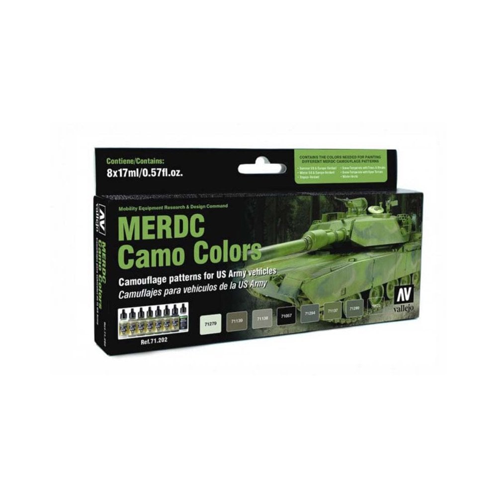 MERDC Camo colours Set Vallejo Model Air 71.202 Matt acrylic colors, water-based and especially formulated for airbrushing. The Model Air color range contains the most complete selection of the military colors used in recent history, including the colors of WWI, WWII and up to the present. Each color is based on extensive research by our experts of the existing and previous military references so as to offer the modeler the highest possible historical accuracy. Model Air is used directly or diluted with Vallejo Airbrush Thinner or Flow Improver. It is recommended to first prime the surface, and then apply Model Air in several layers. The colors dry very rapidly and form a homogenous paint film of extraordinary resistance while preserving even the smallest detail of the model. For airbrushing these colors, the compressor air pressure is recommended at 15 ‚¨ 20 PSI or 0.5 to 1 kg. Model Air can of course also be applied with a brush. For correct airbrush maintenance we recommend using the Vallejo Airbrush Cleaner.Safety:¬¨‚†Model Air is not flammable, and does not contain solvents. Please see also certified safety information of the product on the Safety page.Packaging:¬¨‚†Model Air is presented in bottles of 17 ml./0.57 fl.oz. with eyedropper. This packaging prevents the paint from evaporating and drying in the container, so that It can be used in minimal quantities and preserved for a long time.