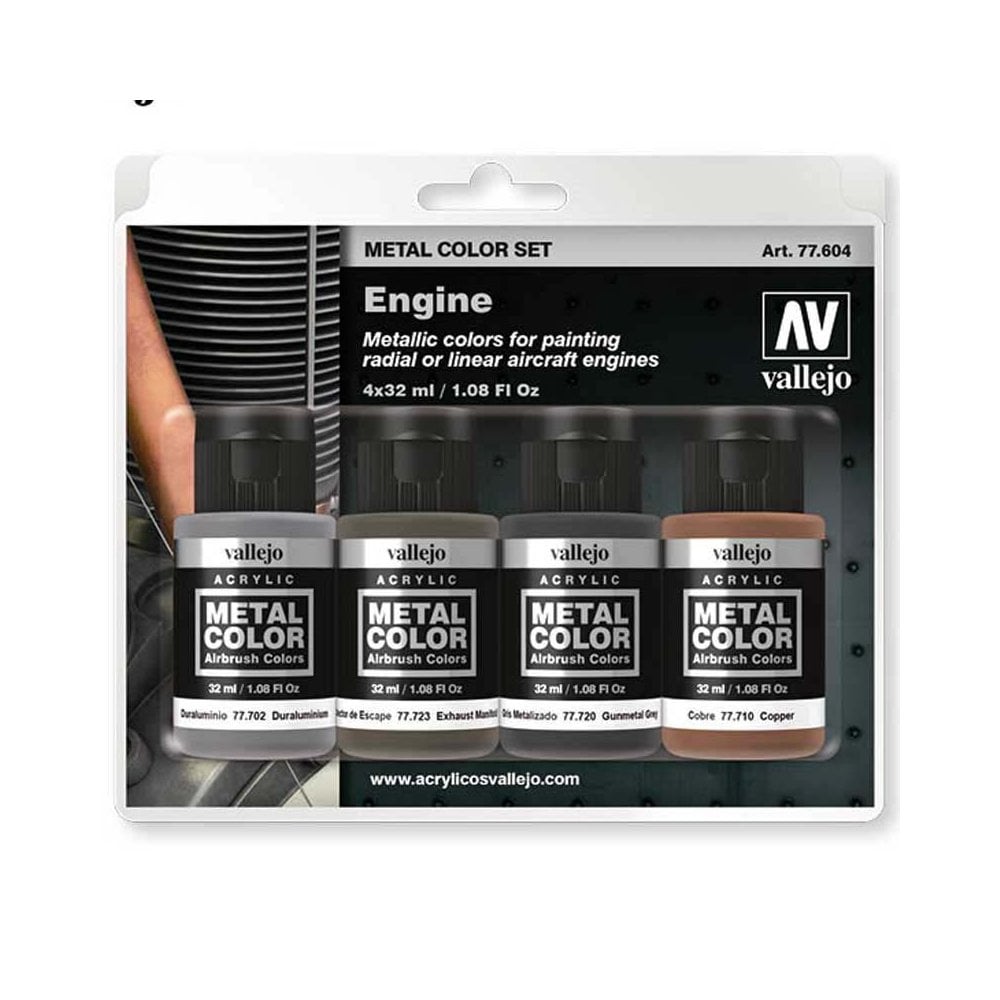 4 Metal Color bottles for painting radial or linear aircraft engines. The colors included in the set can be used as a base for painting most of the radial or linear engines of any period.Content:4 x 32 ml./1.08 fl.oz. Metal Color77.702 Duraluminium77.710 Copper77.720 Gunmetal Grey77.723 Exhaust Manifold