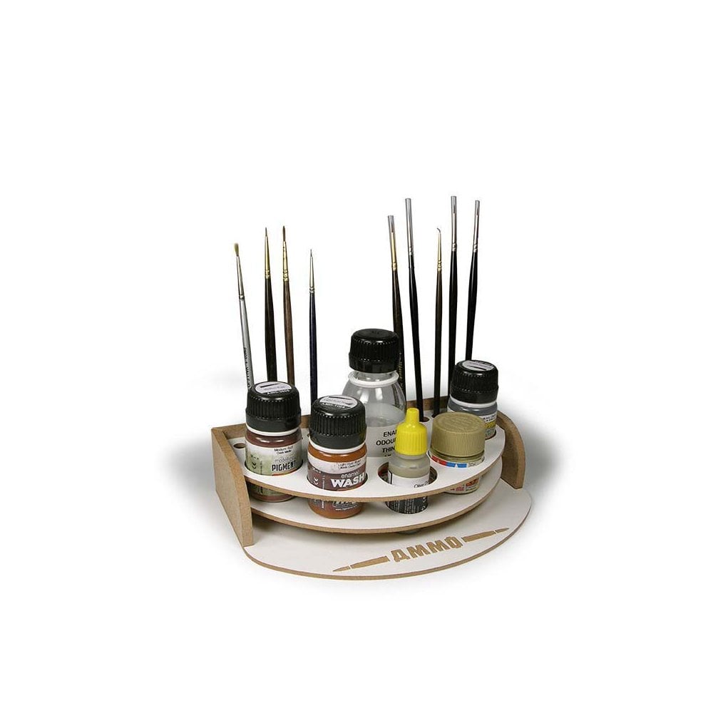 Organizer for 10 brushes 5 bottles of 17 or 35 mL and a glass.The most convenient way to organize the paints and brushes with which we are working at the time. This smallorganizer allows us to put 5 jars with which we are going without the risk of rolling over, either 17 or 35 mLinterchangeably. It also allows you to place a plastic cup or bottle of 100 mL and 10 brushes. Its small size makesit perfect to help paint anywhere no matter how small the space available is. A perfect solution also for travel ormodeling meetings.
