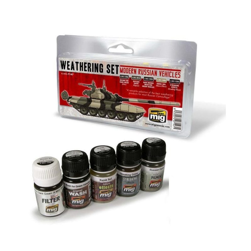 This new set includes a selection of all basic and necessary products to weather most of the current Russian vehicles, either in a single green or with some of the most popular contemporary camouflage. The set includes everything from the initial filter, washed, drained effects, land and pigment. This basic selection ensures optimal and real finishes for these popular vehicles.It includes 5 products enamel cans 35 mLA.MIG-1005 DARK BROWN WASH FOR GREEN VEHICLES