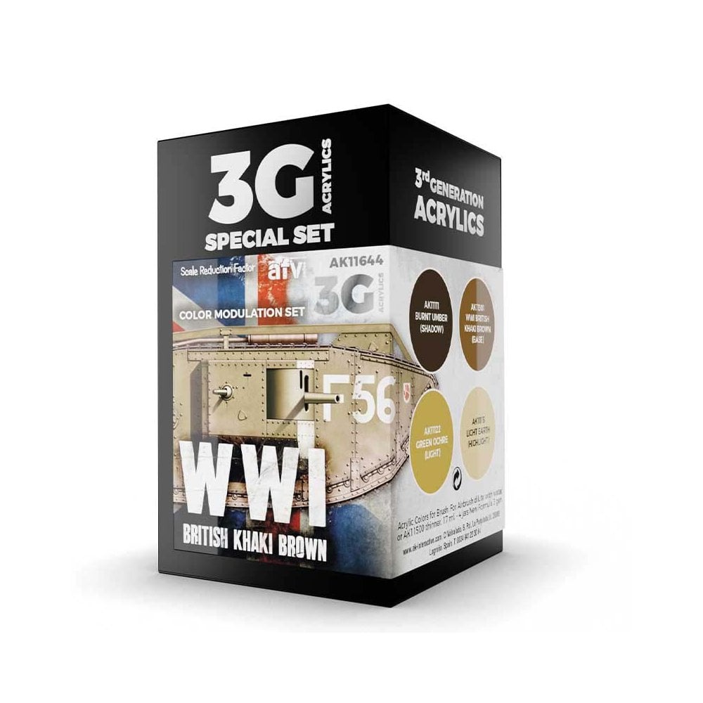 A special set of 3rd Generation acrylic paints intended for finishing British tanks from WW1 period painted in Khaki Brown, using the modulation technique.The Khaki Brown color was created to disguise such low speed monsters in the mud and mire of No Mans Land.Each color is different and combining them allows for easy creation of a visual volume to your model and achieving subtle color transitions.It is recommended not to avoid using any color during the process. The paints can be mixed with each other to get futher subtle tonal variation useful for larger areas or for larger models. This set contains:AK11111 Burnt Umber (Shadow).AK11301 WWI British Khaki Brown (Base).AK11122 Green Ochre (Light).AK11115 Light Earth (Highlight).