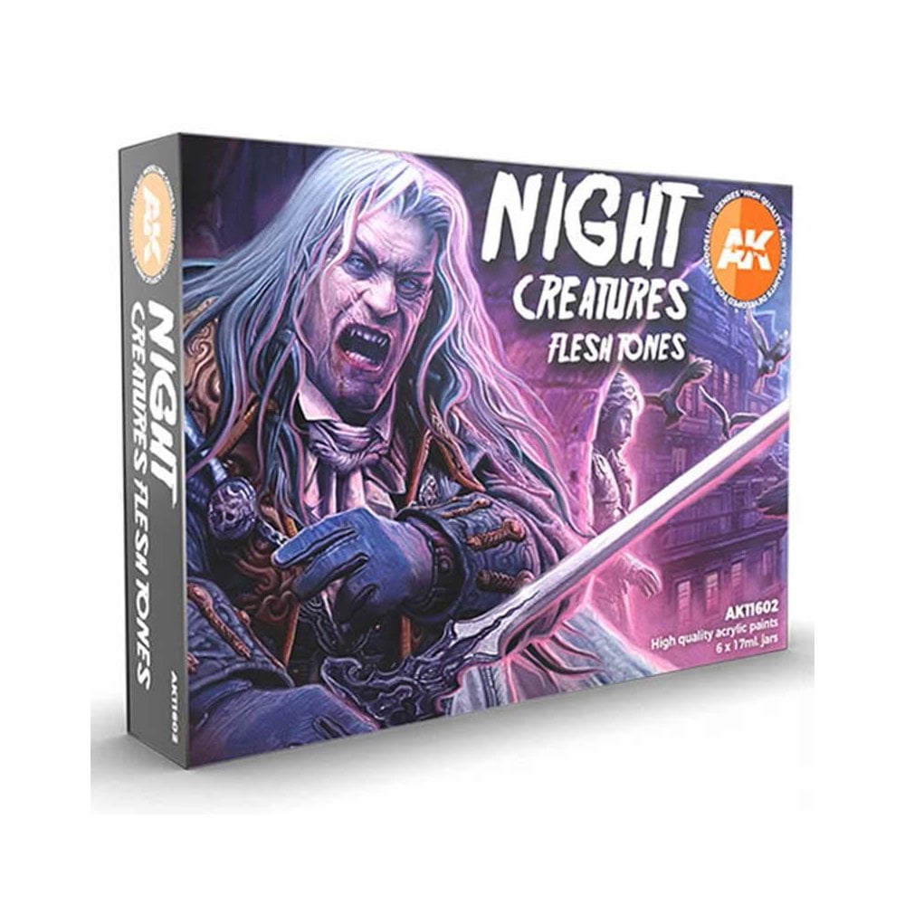 Night Creatures Flesh Tones 3rd Gen Acrylic Set AK Interactive AK11602This set contains 6 acrylic colors, essential for painting pale flesh tones on anyfigure or accessory. These paints can be easily mixed with each other, allowingfor the hassle-free creation of smooth transitions between lights and shadows.They can be applied by brush, taking advantage of the 3rd generation highcoverage and adhesion. Diluted can be airbrushed as easily as lacquer-basedpaints. Matte finish.The set contains:AK11002 OFFWHITE / AK11026 TENEBROUS GREY / AK11057 VAMPIRIC FLESH /AK11067 MAGENTA / AK11074 DEEP PURPLE / AK11095 DIRTY RED