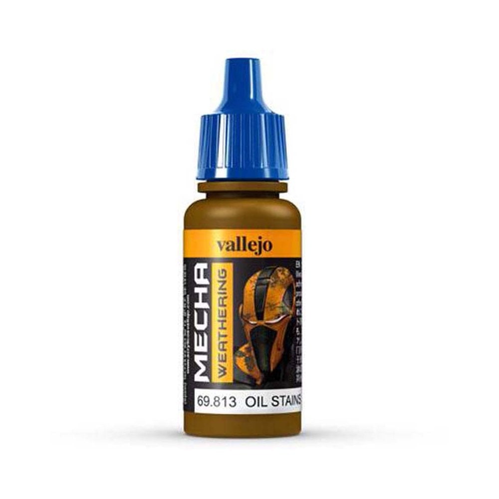 Oil Stains (Gloss) 69.813 Vallejo Mecha Color New formula acrylic colors with a satin finish, extra resistant and impact proof especially designed for airbrushing surfaces exposed to aggressive manipulation. The advanced formulation contains a revolutionary component which guarantees exceptional adherence on even the most difficult surfaces, and offers great resistance to rough handling, impact, friction, scratches, etc. Once dry, the Mecha surface looks the same as the original plastic of the model, while yet the smallest details of the original remain clearly visible. The color range includes primers as well as special varnishes ‚¨ also with an exclusive formulation- and a series of colors for aging and weathering effects. It is recommended to apply the Mecha colors in several layers on the previously primed surface; a few hours after application the colors will have dried to form a homogenous coating of extraordinary strength and resistance. Mecha Color can be airbrushed directly or diluted with Vallejo Airbrush Thinner or Flow Improver, and the colors can also be applied by brush. The compressor adjustment recommended is 15 ‚¨ 20 PSI o 0.5 to 1 kg. For best airbrush maintenance we recommend using the Vallejo Airbrush Cleaner.Safety: Mecha Color is not flammable, and does not contain solvents. Please see also certified safety information of the product on the Safety page.Packaging: Mecha Color is available in 17 ml./0.57 fl.oz. bottles (with eyedropper). Mecha Primer and Mecha Varnish are also available in 60 ml./2.02 fl.oz. and 200 ml./6.76 fl.oz. bottles (with flip top and eyedropper).