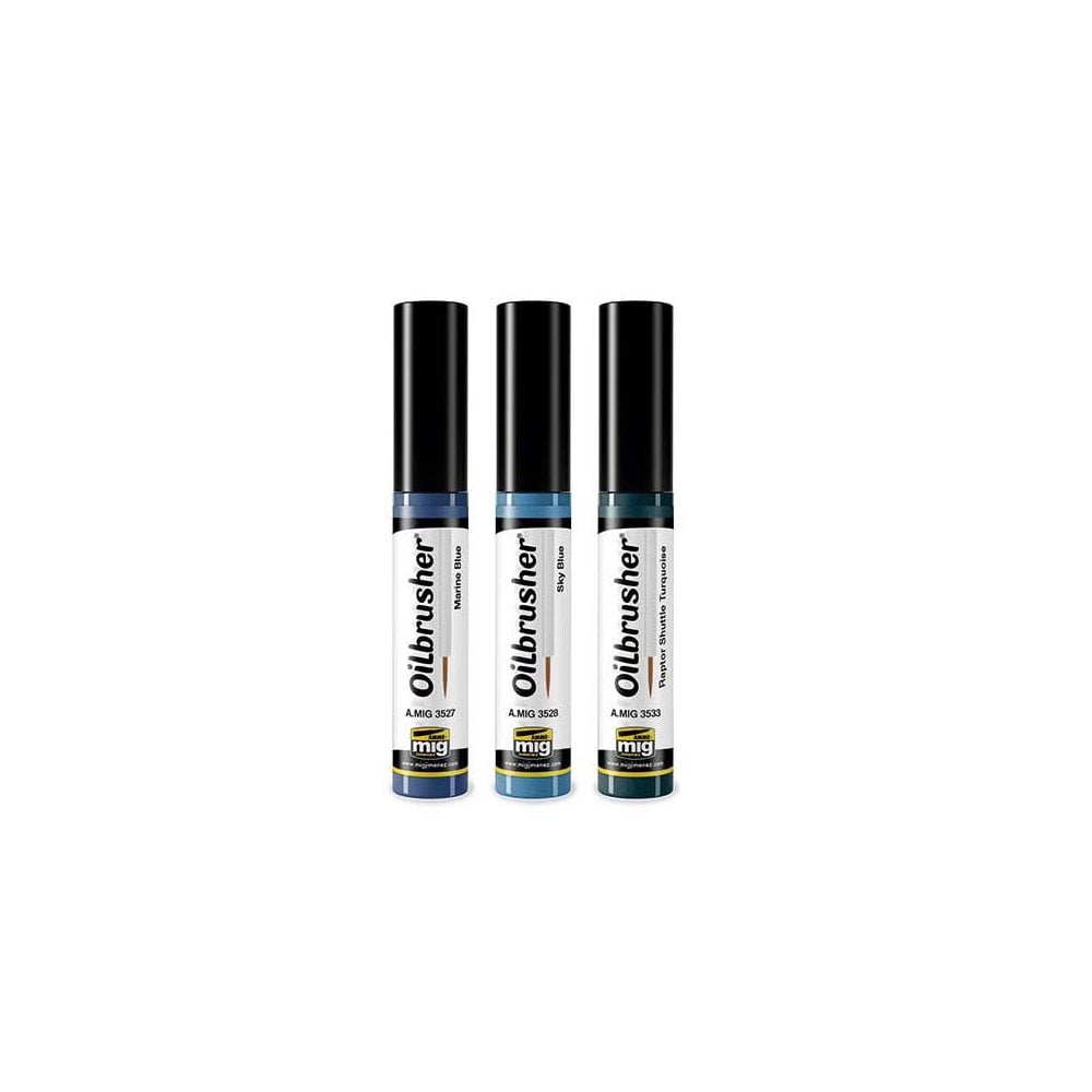 This unique range of Oilbrusher painting and weathering sets offers the convenience and accuracy that you expect from AMMO by Mig Jimenez. Each set contains the correct 3 tones for each task, making the choice of colors simple.Oilbrusher is the innovative oil paint with built-in applicator brush; this unique and innovative AMMO feature ends the need to clean up messy oils after each use. The modern container also includes the dispenser–cleaner system which removes excess paint from the brush. This revolutionary design saves both product and cost, while offering a clean and simple to use alternative to traditional oils which are both expensive and inconvenient.Oilbrushers are specifically formulated for modeling use. This means that your oils are diluted to the perfect consistency to be applied directly onto your model for a glaze free finish. No longer do you need to place the oil paint onto a pallet or piece of cardboard when painting, eliminating time wasted preparing and cleaning.This set includes:A.MIG-3527 Marine BlueA.MIG-3528 Sky BlueA.MIG-3533 Raptor Shuttle Turquoise These sets do not come in a plastic case, individual items only