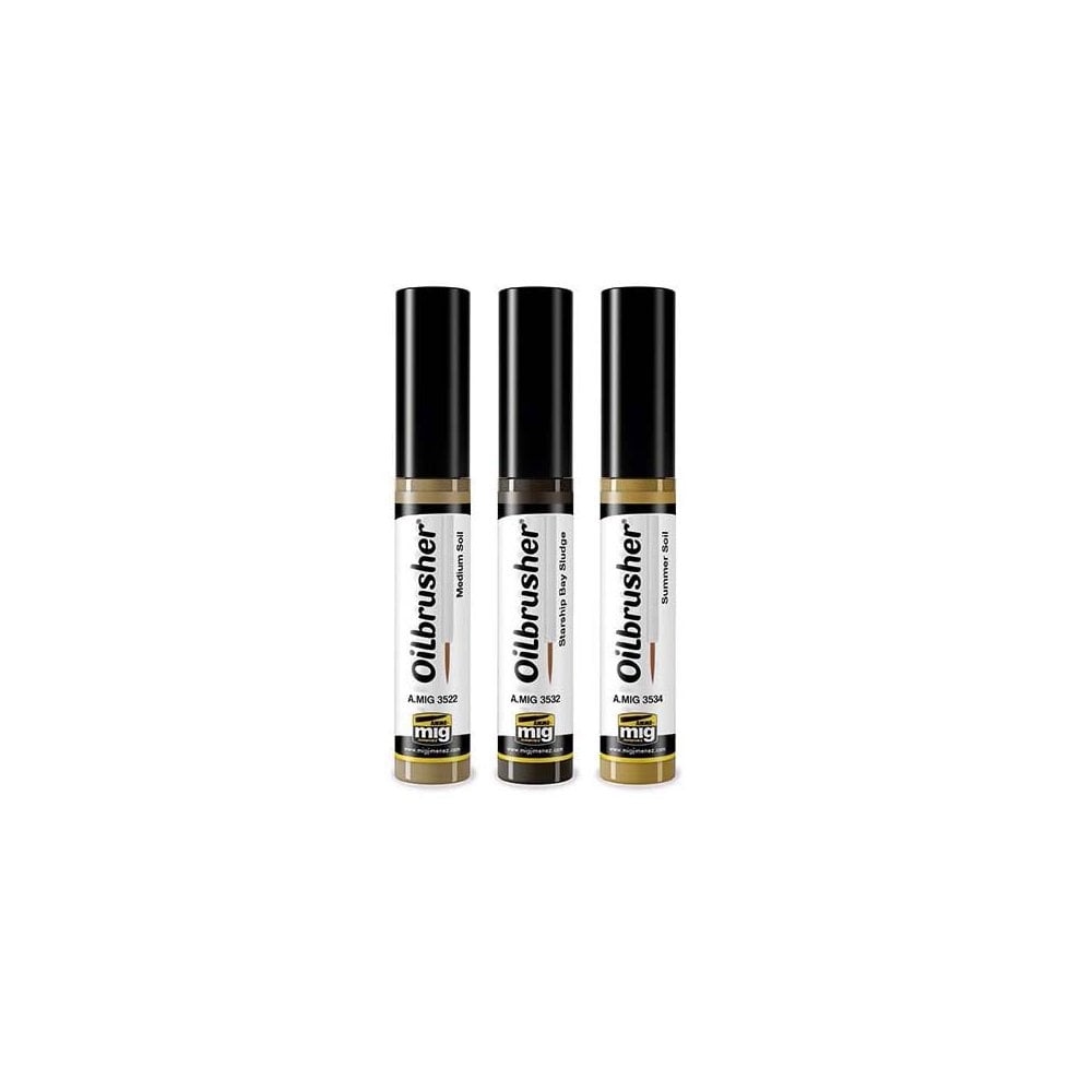 This unique range of Oilbrusher painting and weathering sets offers the convenience and accuracy that you expect from AMMO by Mig Jimenez. Each set contains the correct 3 tones for each task, making the choice of colors simple.Oilbrusher is the innovative oil paint with built-in applicator brush; this unique and innovative AMMO feature ends the need to clean up messy oils after each use. The modern container also includes the dispenser–cleaner system which removes excess paint from the brush. This revolutionary design saves both product and cost, while offering a clean and simple to use alternative to traditional oils which are both expensive and inconvenient.Oilbrushers are specifically formulated for modeling use. This means that your oils are diluted to the perfect consistency to be applied directly onto your model for a glaze free finish. No longer do you need to place the oil paint onto a pallet or piece of cardboard when painting, eliminating time wasted preparing and cleaning.This set includes:A.MIG-3522 Medium SoilA.MIG-3532 Starship Bay SludgeA.MIG-3534 Summer Soil These sets do not come in a plastic case, individual items only