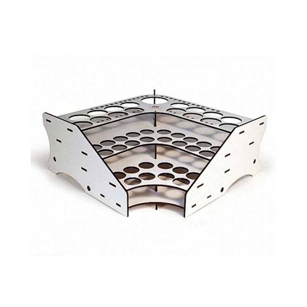 The perfect solution for storing Vallejo colours.The Corner Module Vallejo Paint Stand has space for 28 bottles of Vallejo colour in 17ml size, together with 16 bottles of 35ml or 60 ml, one 200ml bottle and 26 brushes.The Corner Module can be combined with the Front Module to suit your needsEasy to assemble and does not require glueSize: Length 10.6″ (27cm), Width 10.6″ (27cm) and Height 4.3″ (11cm)