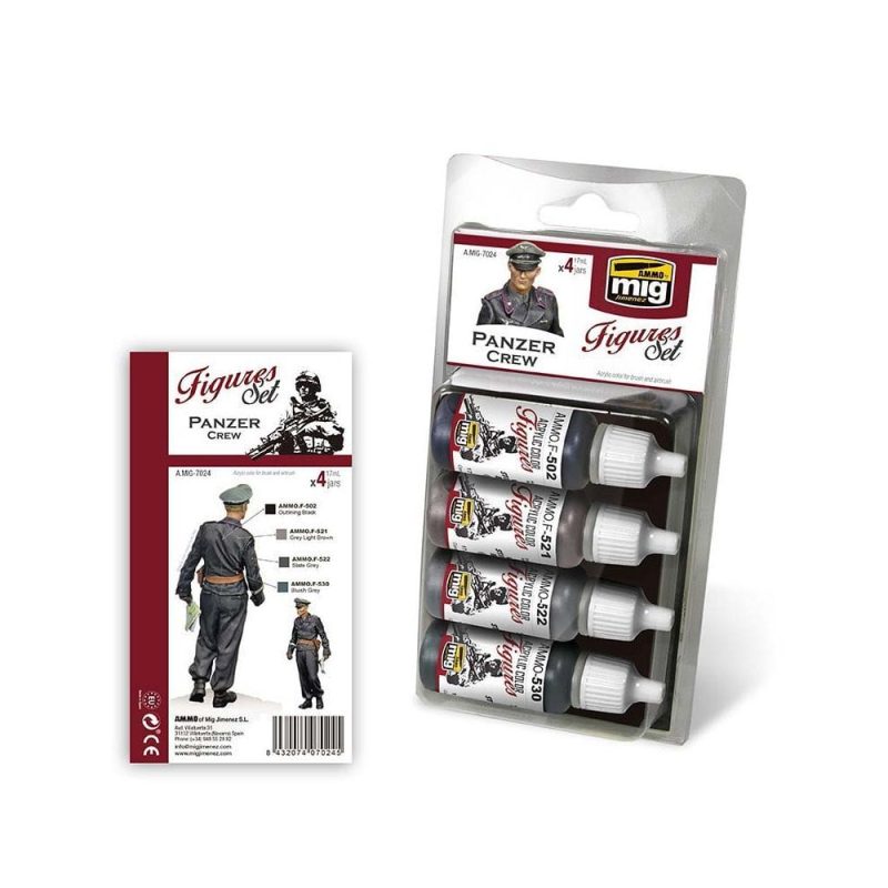 Panzer Crew Set Ammo Mig Jimenez AMIG7024This set includes 4 colours for painting the uniform of German Panzer crews during WWII. The colours have been selected through rigorous research of period uniforms, allowing you to accurately paint the base tones of uniforms, add highlights, and enhance details.Includes the colours:AMMO.F-502 OUTLINING BLACKAMMO.F-521 GREY LIGHT BROWNAMMO.F-522 SLATE GREYAMMO.F-530 BLUISH GREY The range of acrylic colours for figures has been designed to make painting a pleasant activity due to its speed and ease of application, making the best results and new techniques more accessible to model enthusiasts. All the colours in the range can be mixed with each other and with the full range of AMMO by Mig Jimenez acrylic colours. Each adapts perfectly to the traditional techniques of painting in layers or wet pallet blending as well as new mixed techniques. Each colour is suitable for both brush and airbrush application. These acrylics are water-soluble and formulated to be safe and non-toxic.