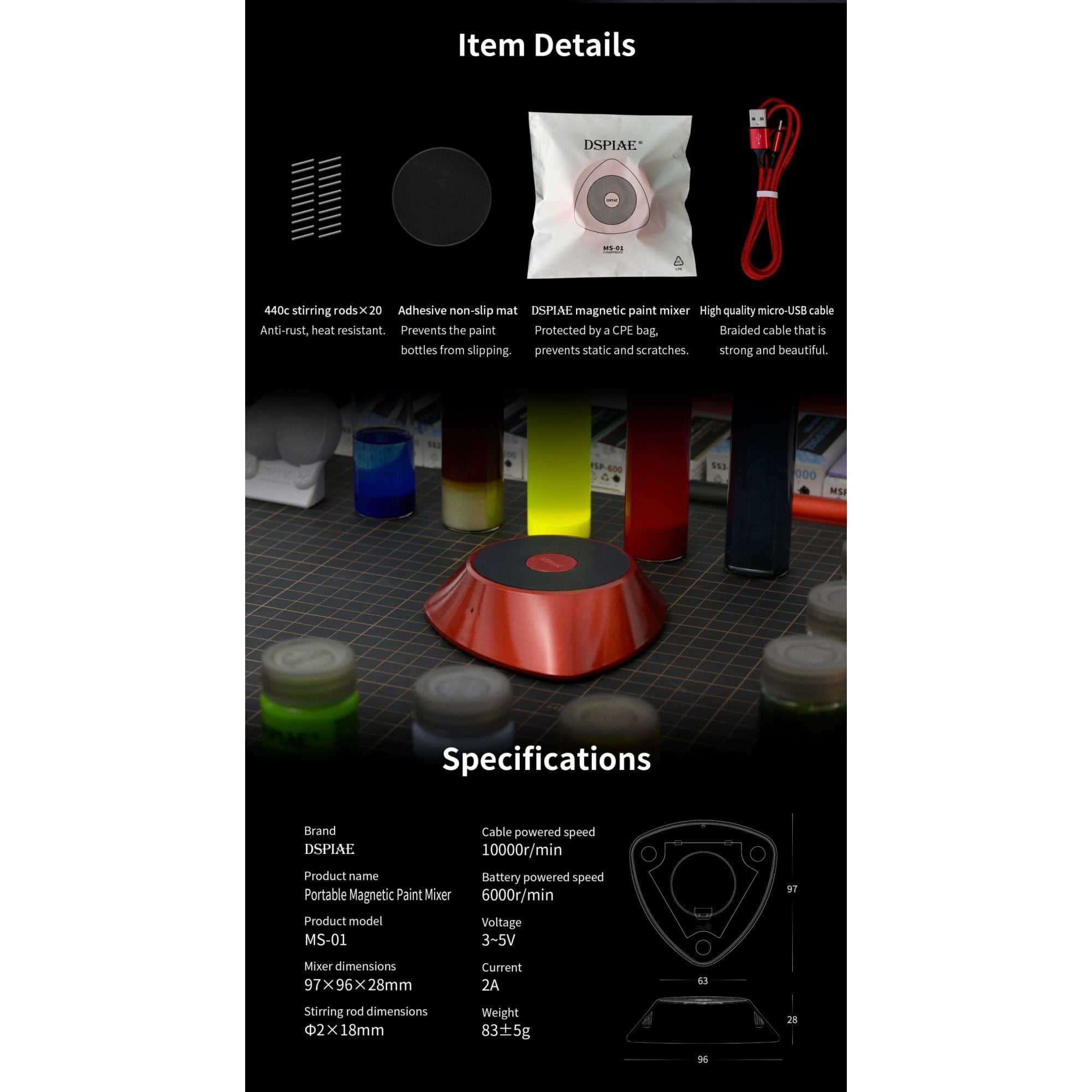 The DSPIAE MS‑01 is a compact, magnetic paint mixer designed to ensure consistent pigment dispersion without shaking or stirring. Ideal for model paints, enamels, lacquers, and inks, this tool prolongs pot life and delivers smooth, bubble-free application.