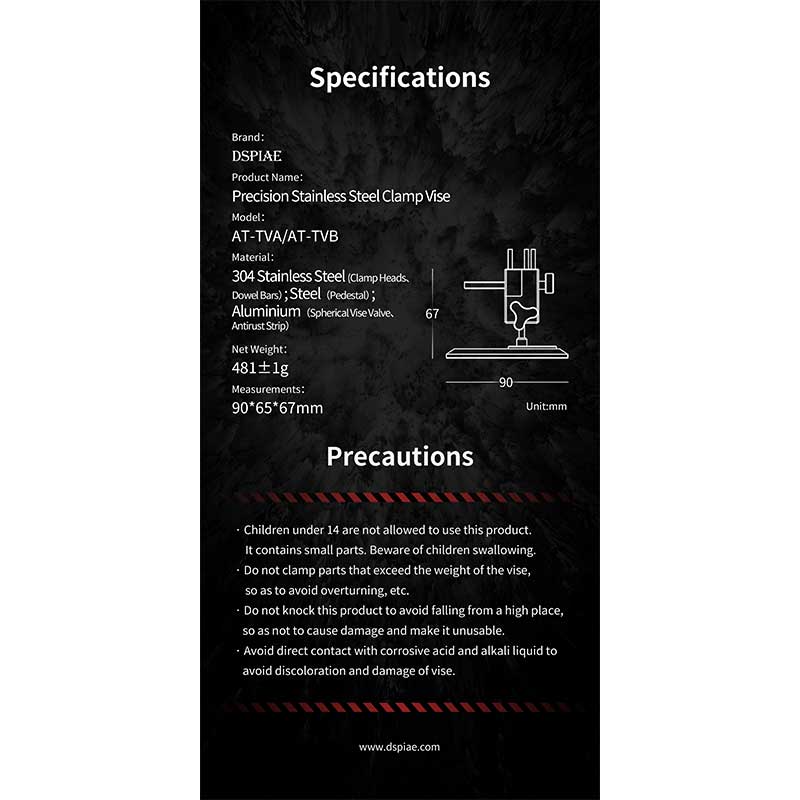 The DSPIAE AT‑TVA+B is a high-grade clamp vice crafted from corrosion-resistant stainless steel with a sleek black finish. Designed for scale modelling, electronics, jewellery making, and precision hobby tasks, this vice securely holds small parts for cutting, filing, gluing, and assembly with exceptional stability.