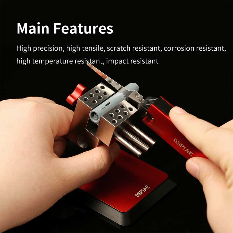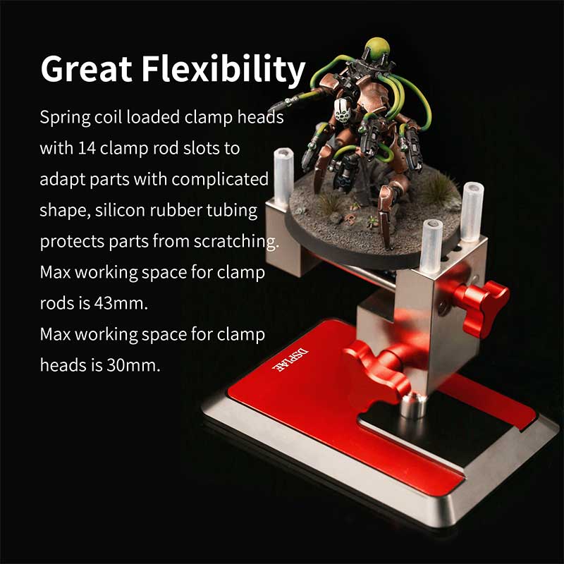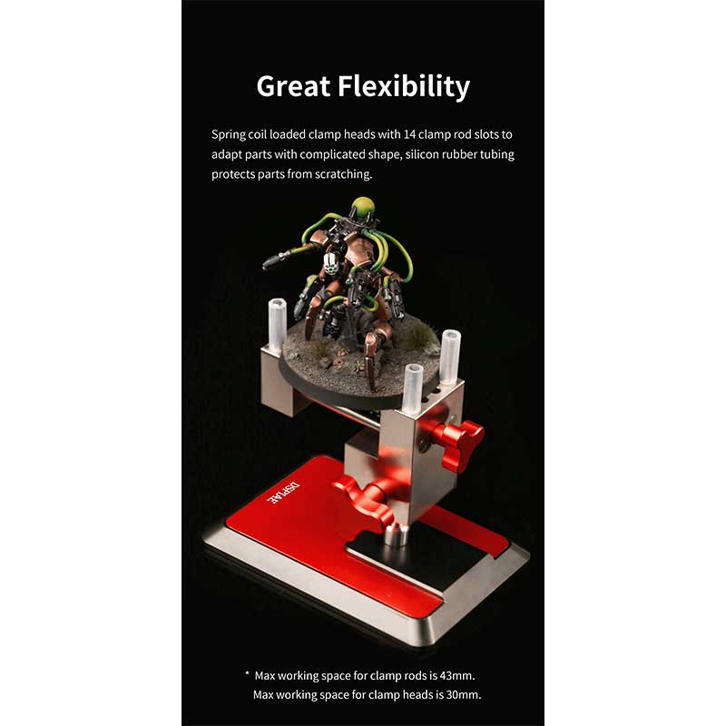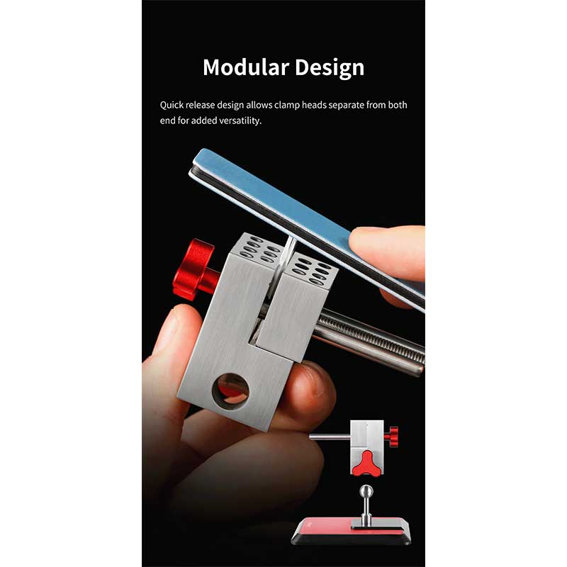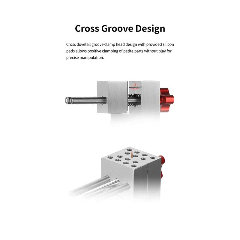 - Adjustable clamp mechanism firmly holds small components without crushing