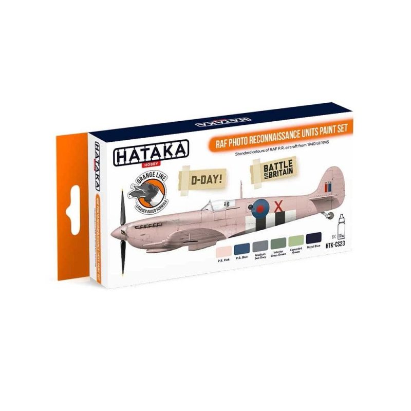 RAF Photo Recon Units Set (Orange Line Lacquer) Hataka CS23DESCRIPTIONORANGE LINE lacquer based paintsStarting from instruction no A.926 (12/1940) aircraft of Photo Reconnaissance Units (P.R.U.) were to be coloured in accordance with operational requirements, without the need to conform with general RAF standards. First P.R. planes wore overall Camotint Green. Later P.R. Blue (for high-alt missions, sanctioned from 10/1944) and P.R. Pink (for low-alt missions / low-clouds-base conditions) were used on most of P.R. planes, except for those operating in North Africa and Far East, which used overall Royal Blue instead (better suited for local conditions).Contains the following colours (lacquer based paints, optimised for use with airbrush):HTK-C024 P.R. Pink Overall colour of RAF P.R. aircraft operating at low altitudes from 1940 (incl. Spitfire PR I) to 1944 (incl. Spitfire FR IX)HTK-C042 P.R. Blue Overall colour of RAF P.R. high-flying aircraft (widely used from 1941). Also on undersides of high-flying day fightersHTK-C034 Medium Sea Grey Used on upper surfaces of RAF high-flying day fighters from May 1943 (including Spitfire Mk VII and Mk IX)HTK-C025 Interior Grey-Green Standard colour of cockpit interiors of RAF aircraft throughout the warHTK-C051 Camotint Green Overall colour of early Photo Reconnaissance Spitfires (converted from Mk I models)HTK-C055 Royal Blue Overall colour of P.R. aircraft in North Africa and Far East incl. Spitfire PR Mk IV, but also Hurricane PR Mk II