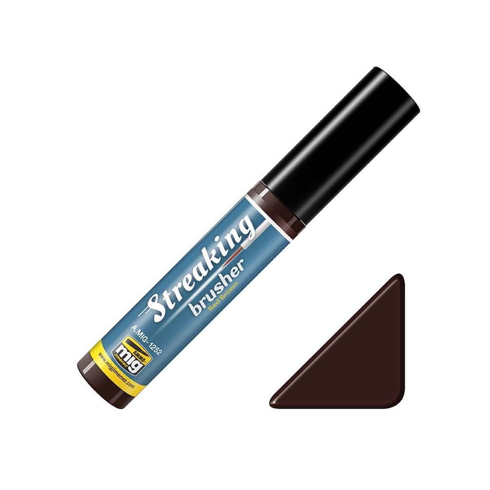 Red Brown Streaking Brusher Ammo Mig Jimenez A.MIG-1252One of AMMO´s best and most popular classic products is now available in an innovative container that will make the entire process of adding streaking effects to your models a more enjoyable experience with accurate results. The STREAKING range of products must be applied with a brush in vertical lines to be blended, create the effect of streaked dirt and grime. To simplify this universally used technique, AMMO has turned to the innovative presentation utilized for our OILBRUSHERS range: a container with a built-in brush suited to the technique making application much easier and quicker.The new STREAKINGBRUSHER range feature a unique applicator brush with longer bristles which facilitate tracing the long and narrow vertical lines of this particular weathering effect. This new applicator brush will definitely save you valuable modelling time with ease of application and clean up. The unique bottles take up less space on your workbench, and up to 70% less surface area of your workspace when compared to the original presentation of the Streaking line. Save time, space, and effort when applying painting and weathering effects with the new and innovative STREAKING BRUSHER.