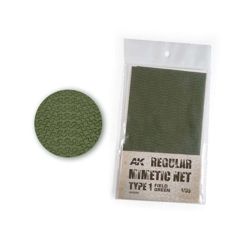 Regular Mimetic Net Type 1 Field Green AK Interactive AK8066Size: 1623 cmSpecial ClothModern 1/35 Camouflage Mimetic Nets special for your modern vehicles, you can decorate with acrylics, enamels or use it directly in your model to achieve a realistic camouflage depending on the situation and environment chosen for the model.