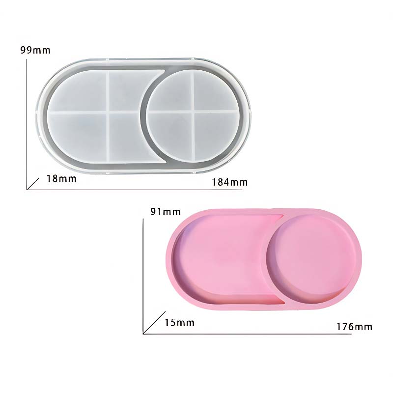 This dual-cavity tray mould is designed to create sleek, modern resin trays ideal for display pieces, jewellery, decorative accents, or general desk organisation. The elongated capsule outline features one larger oval cavity and a smaller circular cavity, giving the finished piece a clean, minimalist look that suits a wide range of resin styles.