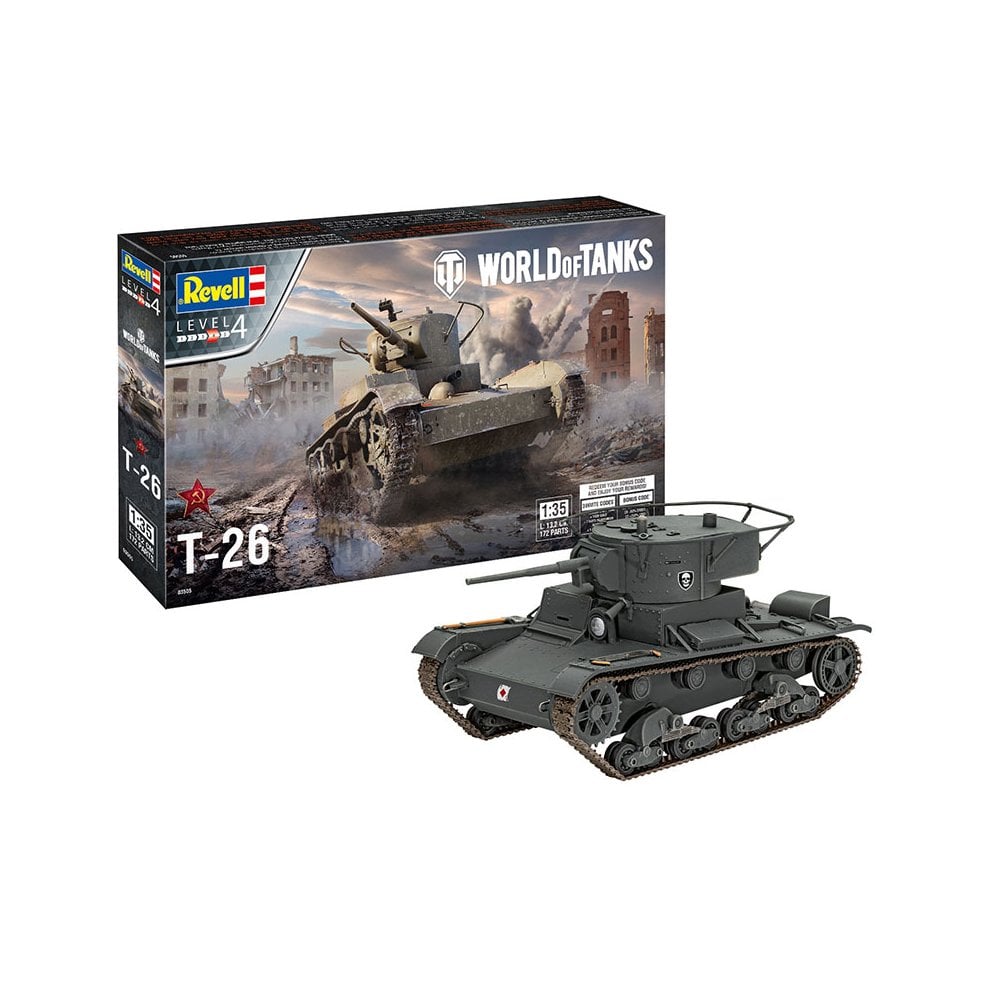 The Revell 1/35 T-26 kit reproduces the iconic Soviet light tank of the interwar and early Second World War era, presented here in a special World of Tanks edition. The model includes finely moulded parts with authentic surface detailing, as well as optional decals for a realistic finish. As part of the World of Tanks collaboration, this kit also includes an exclusive in-game bonus code, making it appealing to both scale modellers and fans of the popular online game.