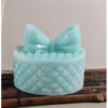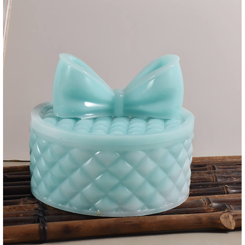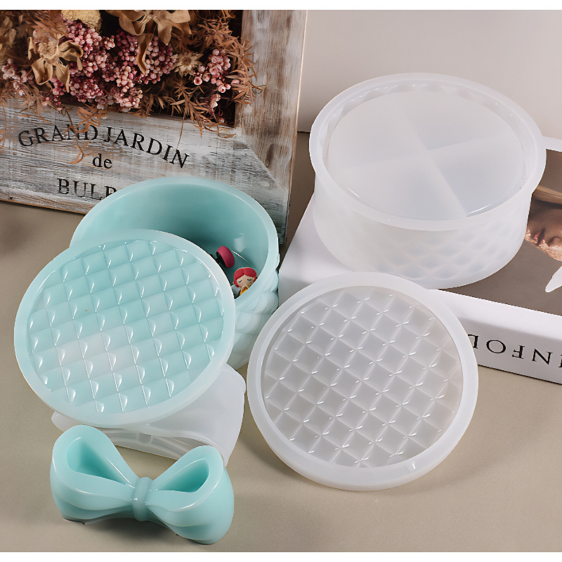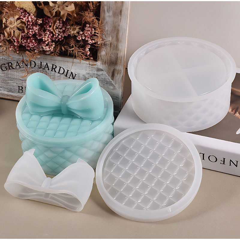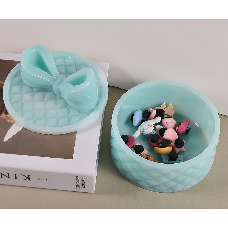 This silicone mould is designed for casting a round storage box with a decorative bow-style lid. The box features a quilted exterior pattern, while the lid incorporates a raised bow detail, creating a presentation-style finish suitable for keepsakes, trinket storage or decorative display.
