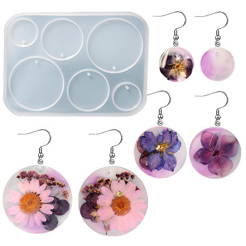 This silicone mould is designed for casting classic round jewellery components in a range of sizes. Each cavity includes a built-in hanging hole, allowing finished pieces to be used directly as pendants, earrings or layered jewellery elements without additional drilling.