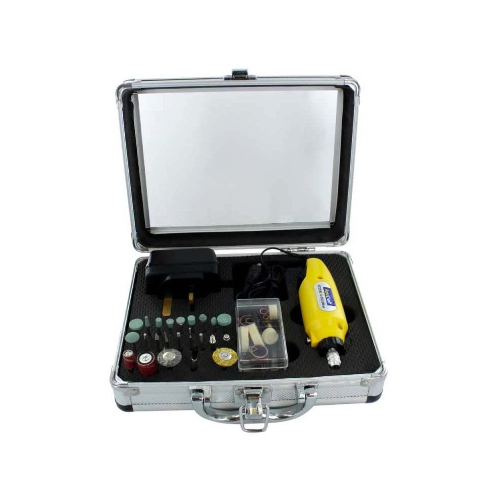 Versatile high speed 12v pen grip tool for control in tight spaces and for precise, intricate work.Ideal for model making, electronics, engraving and small DIY jobs around the home. Includes 44 accessories. Comes contained in a metal case with transparent front.