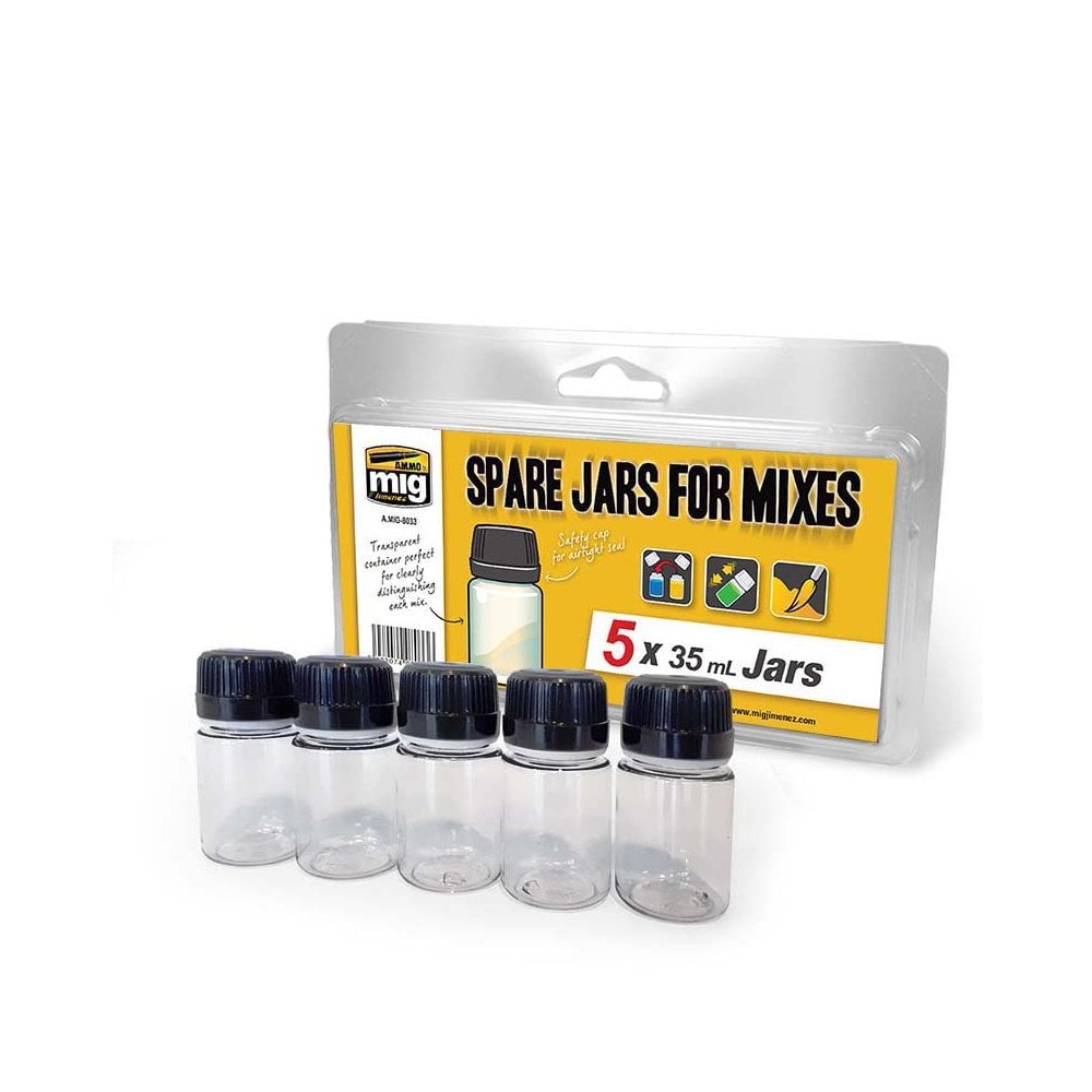 A.MIG-8033 SPARE JARS FOR MIXES (5 x 35 ml jars)Store your paint mixes in these jars easily and efficiently. This pack contains 5 ready-to-use 35ml reusable bottles. The transparent container makes them perfect for clearly distinguishing the color and consistency of each mix. These bottles also have a safety cap for a completely airtight seal.