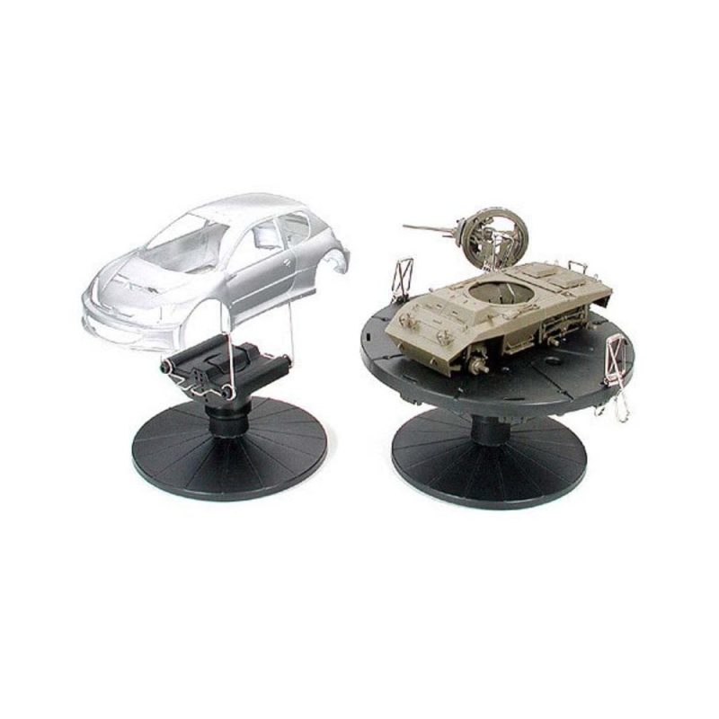 The Tamiya Spray Work Painting Stand Set is a multi-purpose tool designed to make painting easier and more efficient. It includes two versatile stands: a 16cm diameter turntable stand with multiple holes for securing parts, and a body stand ideal for spray painting 1/24 scale car bodies. The turntable allows precise rotation for even paint coverage, while the included spring clips and adjustable holders provide stability and flexibility for parts of various shapes and sizes. This set enables modellers to paint pieces while still on the sprue, or securely mount them using simple holders such as pencils or sticks.