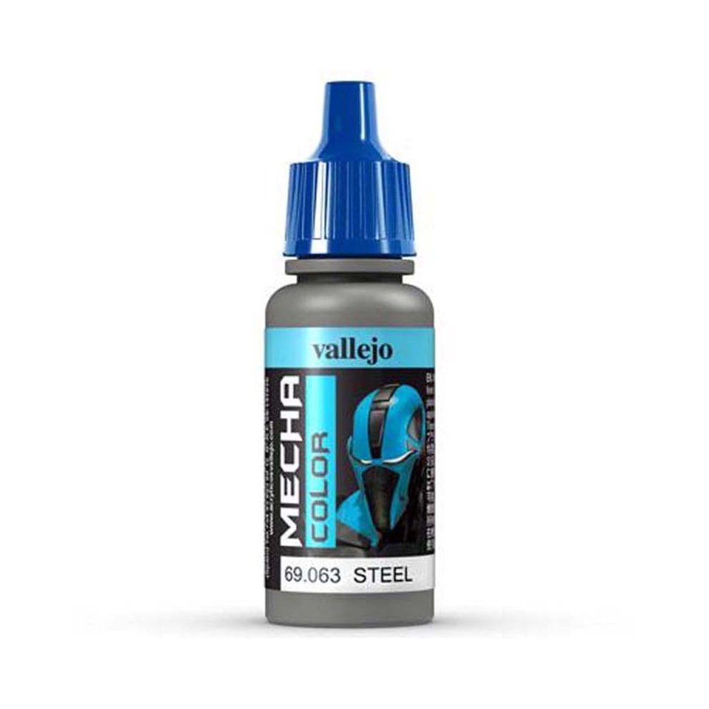 Steel 69.063 Vallejo Mecha Color New formula acrylic colors with a satin finish, extra resistant and impact proof especially designed for airbrushing surfaces exposed to aggressive manipulation. The advanced formulation contains a revolutionary component which guarantees exceptional adherence on even the most difficult surfaces, and offers great resistance to rough handling, impact, friction, scratches, etc. Once dry, the Mecha surface looks the same as the original plastic of the model, while yet the smallest details of the original remain clearly visible. The color range includes primers as well as special varnishes ‚¨ also with an exclusive formulation- and a series of colors for aging and weathering effects. It is recommended to apply the Mecha colors in several layers on the previously primed surface; a few hours after application the colors will have dried to form a homogenous coating of extraordinary strength and resistance. Mecha Color can be airbrushed directly or diluted with Vallejo Airbrush Thinner or Flow Improver, and the colors can also be applied by brush. The compressor adjustment recommended is 15 ‚¨ 20 PSI o 0.5 to 1 kg. For best airbrush maintenance we recommend using the Vallejo Airbrush Cleaner.Safety: Mecha Color is not flammable, and does not contain solvents. Please see also certified safety information of the product on the Safety page.Packaging: Mecha Color is available in 17 ml./0.57 fl.oz. bottles (with eyedropper). Mecha Primer and Mecha Varnish are also available in 60 ml./2.02 fl.oz. and 200 ml./6.76 fl.oz. bottles (with flip top and eyedropper).