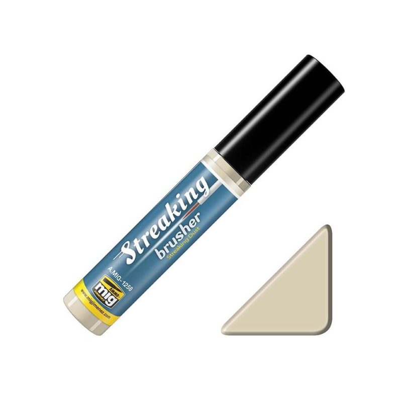 Streaking Dust Streaking Brusher Ammo Mig Jimenez A.MIG-1258One of AMMO´s best and most popular classic products is now available in an innovative container that will make the entire process of adding streaking effects to your models a more enjoyable experience with accurate results. The STREAKING range of products must be applied with a brush in vertical lines to be blended, create the effect of streaked dirt and grime. To simplify this universally used technique, AMMO has turned to the innovative presentation utilized for our OILBRUSHERS range: a container with a built-in brush suited to the technique making application much easier and quicker.The new STREAKINGBRUSHER range feature a unique applicator brush with longer bristles which facilitate tracing the long and narrow vertical lines of this particular weathering effect. This new applicator brush will definitely save you valuable modelling time with ease of application and clean up. The unique bottles take up less space on your workbench, and up to 70% less surface area of your workspace when compared to the original presentation of the Streaking line. Save time, space, and effort when applying painting and weathering effects with the new and innovative STREAKING BRUSHER.