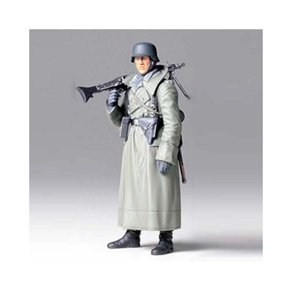 This 1/16 scale plastic figure from Tamiya depicts a WWII German machine gunner outfitted in a heavy greatcoat, suitable for winter or Eastern Front scenarios. The figure captures the stoic, battle-hardened presence of Wehrmacht troops enduring harsh conditions. With a detailed uniform, equipment, and weaponry, this model makes an ideal companion for winter-themed dioramas or as a standalone display.