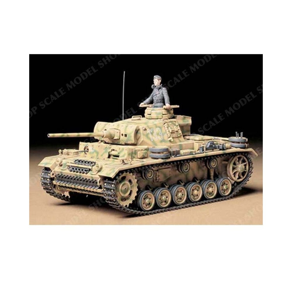 This 1/35 scale Tamiya model kit recreates the German Pz.Kpfw. III Ausf. L, a mid-war upgrade to the Panzer III series that saw action on both the Eastern Front and in North Africa during WWII. The Ausf. L featured a long-barrelled KwK50 L/60 main gun capable of engaging T-34 tanks at up to 600 metres, plus two MG34 machine guns for secondary armament.