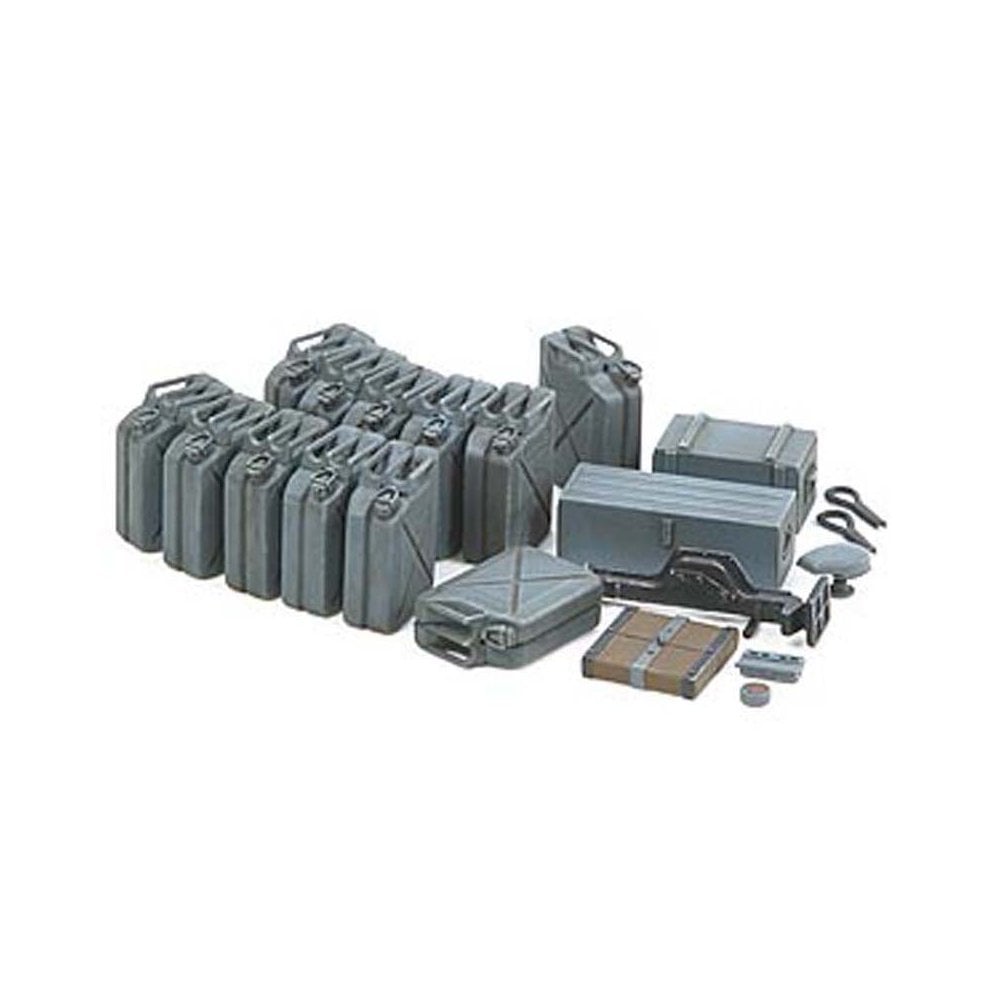 This 1/35 scale accessory set from Tamiya replicates early WWII-style jerry cans, fuel drums, and related stowage items, ideal for enhancing the realism of military vehicle models and dioramas. These containers were a vital part of logistics for armies in the field, ensuring the supply of fuel and water to front-line units.