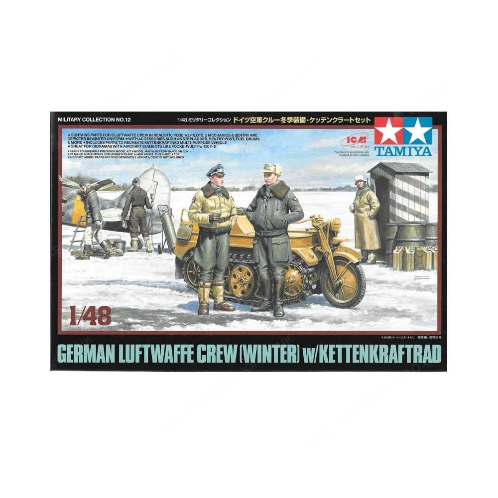 This 1/48 scale set from Tamiya brings together detailed Luftwaffe personnel figures and the iconic Kettenkraftrad light tracked motorcycle. Originally designed for use by German airborne forces, the Kettenkraftrad proved invaluable in a wide range of roles, from towing aircraft and light artillery to transporting supplies across difficult terrain. Its unique design combined motorcycle-style steering with tracked mobility, making it a versatile asset on airfields and front lines alike.