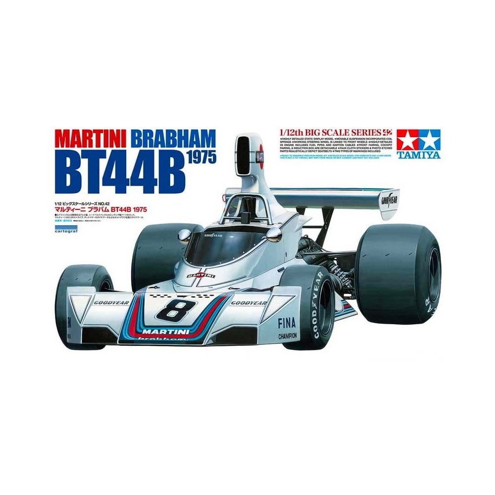 The Tamiya Martini Brabham BT44B 1975 (1/12) offers a faithful recreation of one of Formula One’s most recognisable machines of the mid-1970s. The BT44B was a refinement of the Gordon Murray-designed BT44, fielded by the Brabham team during the 1975 season with sponsorship from Martini Racing. Its clean aerodynamic shape and strong results cemented its status as a classic F1 design.