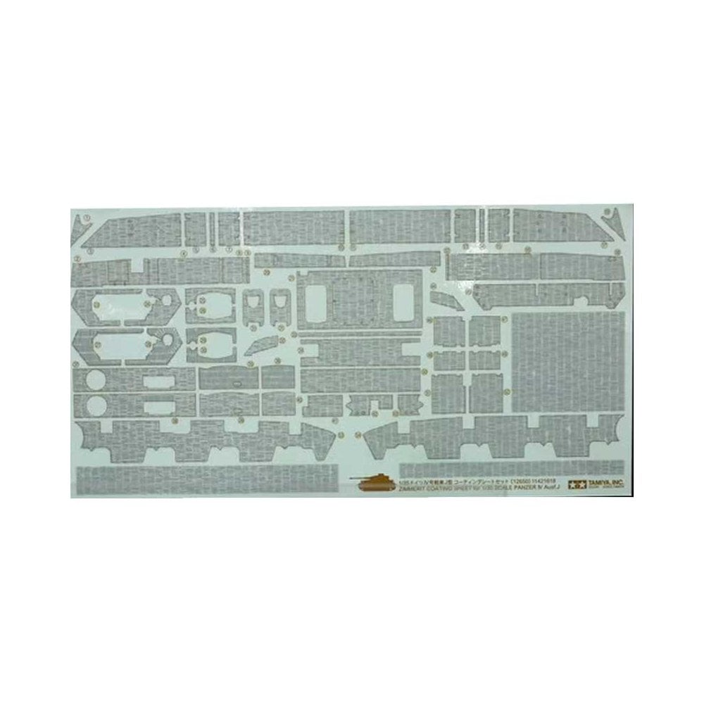 This Tamiya accessory set offers pre-moulded Zimmerit coating sheets for the 1/35 scale German Panzer IV Ausf.J model. Zimmerit was a textured paste applied to German tanks during WWII to prevent magnetic mines from attaching to their surfaces. These sheets are precisely cut to match the contours of the Ausf.J variant, ensuring an accurate and clean application.