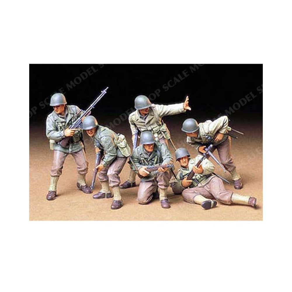 This 1/35 scale figure set from Tamiya depicts U.S. Army assault infantry in action during WWII. The set includes soldiers in dynamic poses, advancing under fire, taking cover, and engaging the enemy. Each figure features finely sculpted uniform details, webbing, and authentic weaponry representative of American infantry units of the period.