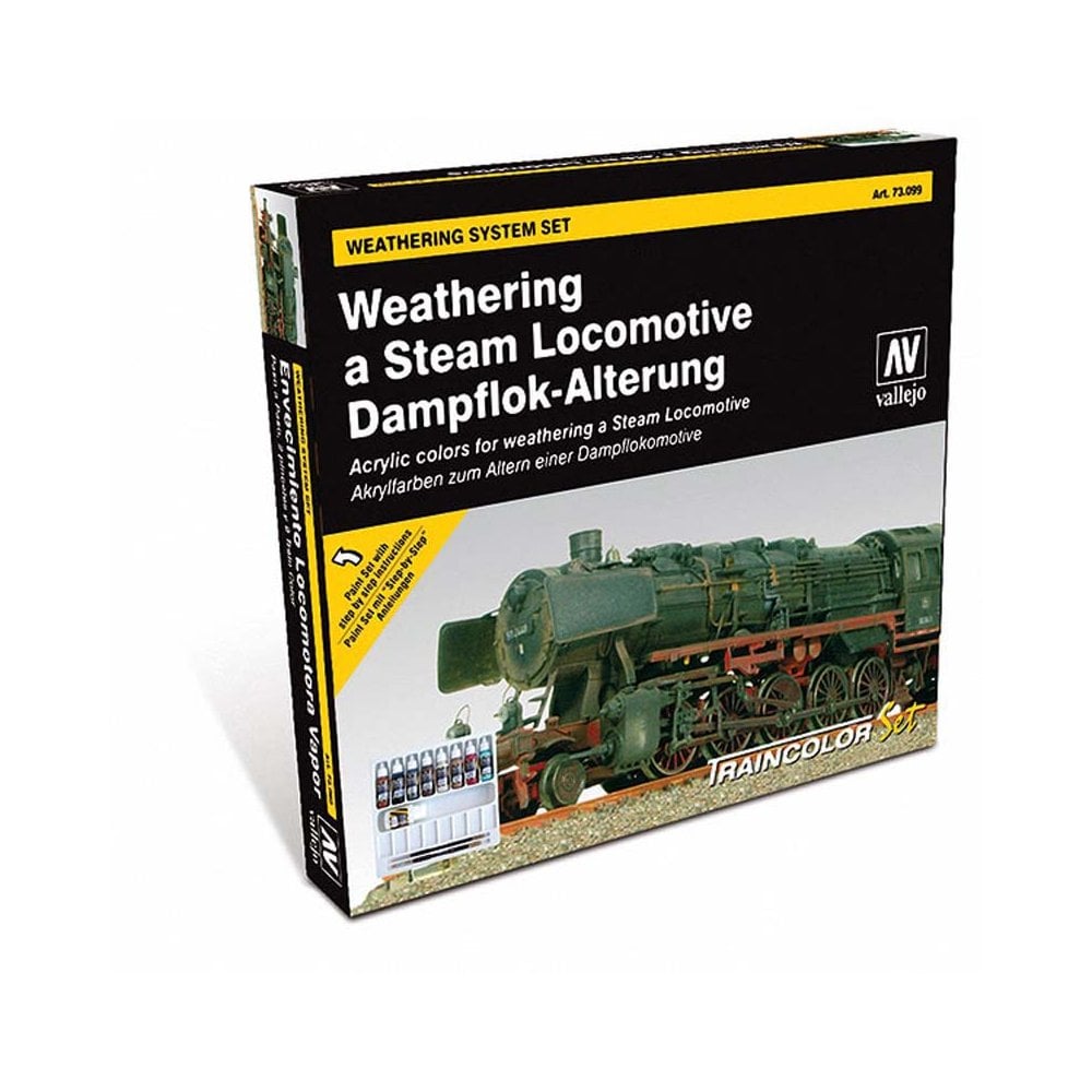 Locomotive Weathering SetModel Colour is indicated for all surfaces, and especially formulated to adhere to Plastics and Polyesters. The colours brush on smoothly, and cover large surfaces easily and without showing brushstrokes. Their texture makes them equally perfect for minuscule details of miniature artwork. All the shades dry to a mat and opaque finish except for the metallic and transparent colours.The transparent colours render a brilliant finish, tint the surface but do not hide woodgrains or other characteristics. On models, they are applied directly for headlights and signal lights; diluted with Mat Medium, these colours are ideal for tinting airplane or car windows(smoked glass). The application of a coat of transparent colour over the same mat colour gives an extra brilliant special effect.Model Colour can be diluted with water, and all colours can be mixed with one another. The products does not contain solvents and is not imflamable. Colours do not contain lead pigments, nor ingredients harmful to health. Error can be corrected inmediately with water, or with a small amount of alcohol. Once paint has dried, it is waterproof and permanent.Contains: 7x 17ml Train Colour Paints, 1x 17ml Liquid Mask, 1x 35ml Matt Varnish, 2 Toray Brushes, Palette, Step By Step Instructions and a Colour ChartVAL 73.001 Basic RustVAL 73.002 Grease & OilVAL 73.003 SteelVAL 73.004 Basic BrownVAL 73.005 DirtVAL 73.006 Chalk WhiteVAL 73.007 Basic RedVAL 73.008 Liquid MaskVAL 73.009 Matt Varnish