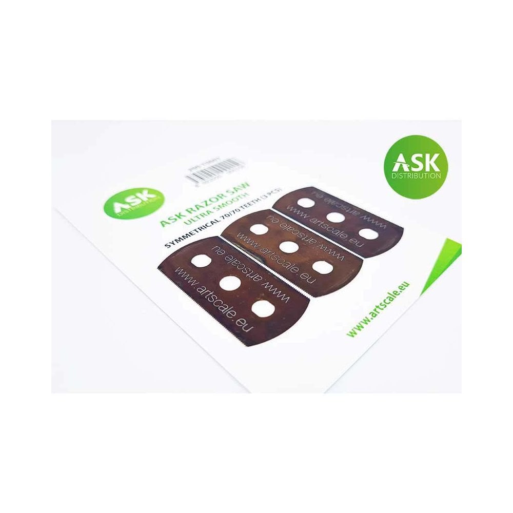 ASK Hardened high tech RAZOR SAW – Made in the Czech Republic.Constant tooth quality (depth, width, number) is what distinguishes this saw from existing traditionally produced saws. The saw is designed for very fine work – cutting plastic sprues and resin casting blocks. Perfect for cutting flaps for repositioning and re-engraving damaged panel lines. The saw is also suitable for cutting wood and thin brass and aluminium tube.This is an innovative high-quality product. The efficient setting of the production process enables a very attractive price – which opposes established standards, where a higher price means higher quality. We have a product of the highest quality – at an attractive price.Package contains 3 saws. Each side of the saw has a different size of teeth (medium and fine).Attention! This product is not a toy. Not suitable for children under 14 years. Children should only use the product under adult supervision.