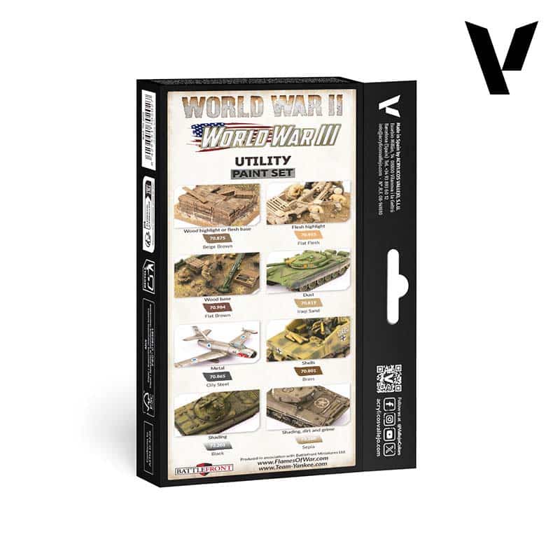 The Utility Paint Set, combined with the specific army sets, contains the necessary colors to paint WWII and WWIII miniatures. In addition, this set offers a selection of complementary colors for flesh tones, wood, armament and washes, as well as for creating weathering and wear effects on vehicles and figures.