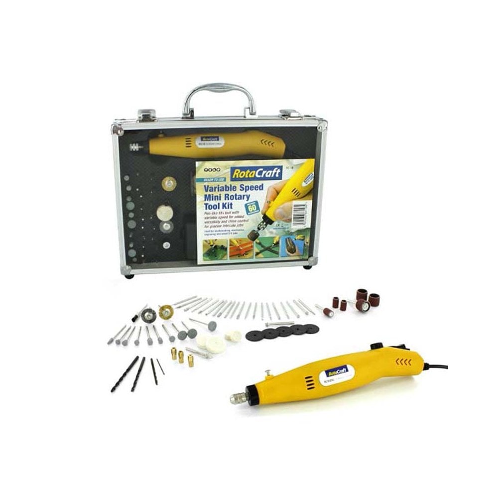 Rotacraft RC18 Variable Speed Rotary Tool Kit [RC18]Mini 12v Variable Speed Rotary tool + transformer In-built variable speed control 8000-18000 rpm 4m total length of cables 60 various accessories Instructions Handy aluminium carry and storage case¬â€
