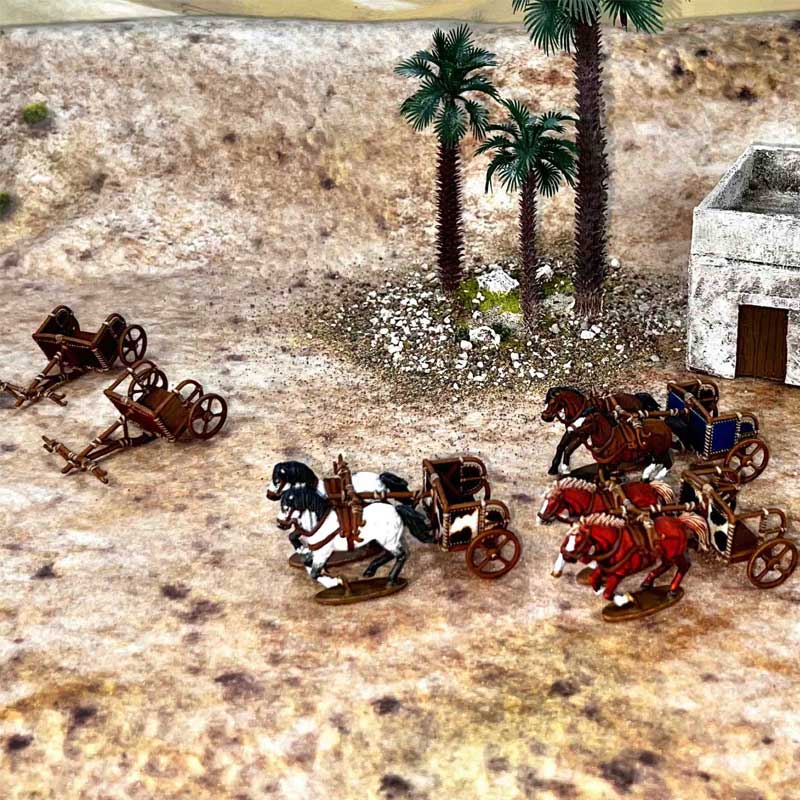 This 28mm plastic set represents a typical Bronze Age design, light yet structurally robust, capable of delivering warriors swiftly into combat before withdrawing just as quickly. Whether used for fast attack roles or as mobile weapons platforms, chariots symbolised power and status as much as battlefield effectiveness.