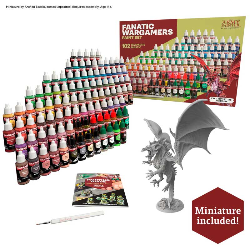 Take your miniature painting to the next level with the Warpaints Fanatic Wargamers Paint Set.This paint set comes with an impressive collection of 102 paints and a Durkar the Sovereign Serpent miniature from Archon Studio. Grab your brushes and Fanatic paints and transform the grey sprues into a magnificent, deadly dragon.The 102 paints in the Wargamers Paint Set have been carefully selected to give you a broad and comprehensive collection of the fan-favourite Fanatic paints. With the 86 brilliant acrylic colours, 6 shining Metallics, 4 Washes, and 6 cool Effects, you can paint everything from a fire-breathing dragon and nobles in regal cloaks to Orcish warriors and alien creatures.Besides a colour selection any novice and experienced painter could dream of, you also get a dragon miniature to put those Fanatic paints to instant use. Also included is a Painting Guide that shows you all the best practices for using our products, with some added inspiration for your next hobby project.Warpaints Fanatic paints are easy-to-use, high-quality, and high-performance acrylic paints with unsurpassed coverage and intense pigmentation.They feature an insanely pigment-dense formulation set in a premium resin base with proprietary stabilizers to ensure smooth, effortless application. Our proprietary Stabilizing Technology enables these paints to be thinned to extreme levels while retaining pigment dispersion, making the paint easy enough for a beginner, fast enough for a gamer, yet capable enough for the best painters in the world!Contents: