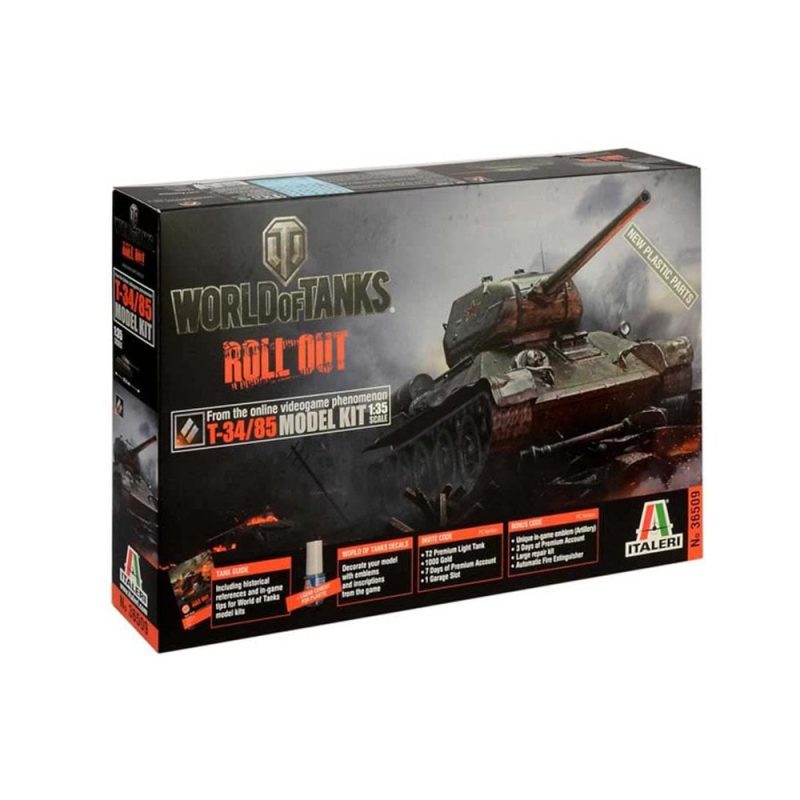 World Of Tanks T-34 /85 Italeri W365091 MODEL KIT – 1 LIQUID CEMENT – 1 TANK GUIDE – WORLD oF TANKS DECALS – 1 INVITE CODES – 1 BONUS CODEArguably the best medium tank of World War II, the T-34-85 was a crucial factor in the outcome of the conflict. Over 35,000 were produced, meaning that it also came to represent, from a Soviet standpoint, the supremacy of socialist industry over capitalism.It was the antithesis of German over-engineering. Designers favoured simple solutions that used fewer resources. It was therefore available in greater numbers a telling factor as Axis forces were pushed out of the Soviet Union and back to Berlin.The T-34-85 was an up-gunned version of the T-34 tank which carried a 76mm gun that was insufficient at dealing with tanks like the Tiger and Panther. A new turret allowed the installation of an 85mm gun that was capable of penetrating German armour with greater ease. This tank also represented the first proper mass production of a sloped-hull design which meant that the armour could afford to be thinner while still providing the same effective protection. Coupled with sloping on the turret, the survivability of the tank compared to the original T-34 design was much better.