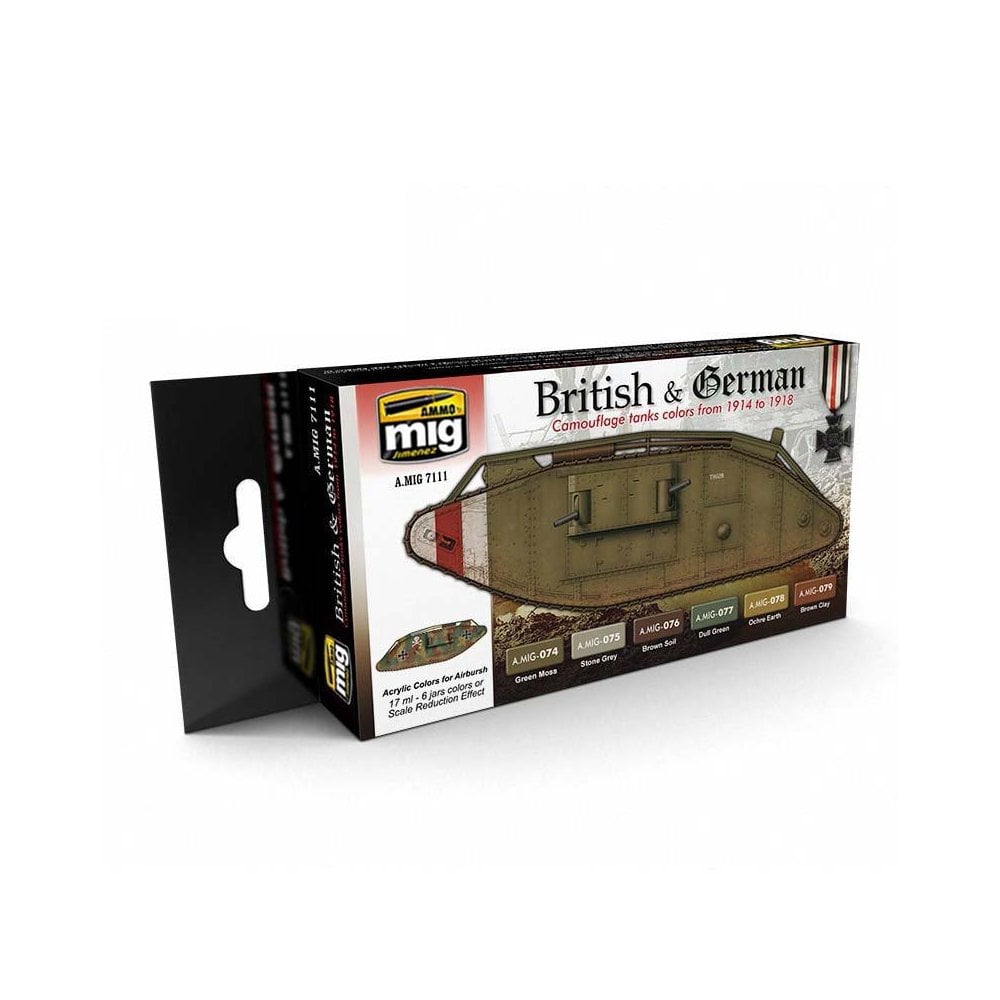 Accurate colors for WW I British & German. 6 jars 17ml Acrylic water based paint for painting WW I German and UK vehicles. This set includes: A.MIG 077 Dull Green,A.MIG 078 Ochre EarthA.MIG-079 Clay Brown for German vehiclesA.MIG 074 Green Moss for most of the UK vehicles during WW IA.MIG-075 Stone Grey,A.MIG-076 Brown SoilA.MIG 078 Ochre Earth For Solomon paint scheme of UK vehicles deployed in Europe.Paints include Scale Effect Reduction, which allows us to obtain the correctcolor on our models. All colors are acrylic and formulated for maximumperformance both with brush or airbrush. Shake well before each use. Each jar includes a stainless steel agitator to facilitate mixture. Water soluble,odorless, and non-toxic. We recommend MIG -2000 Acrylic Thinner for a correct thinning. Dries completely in 24 hours