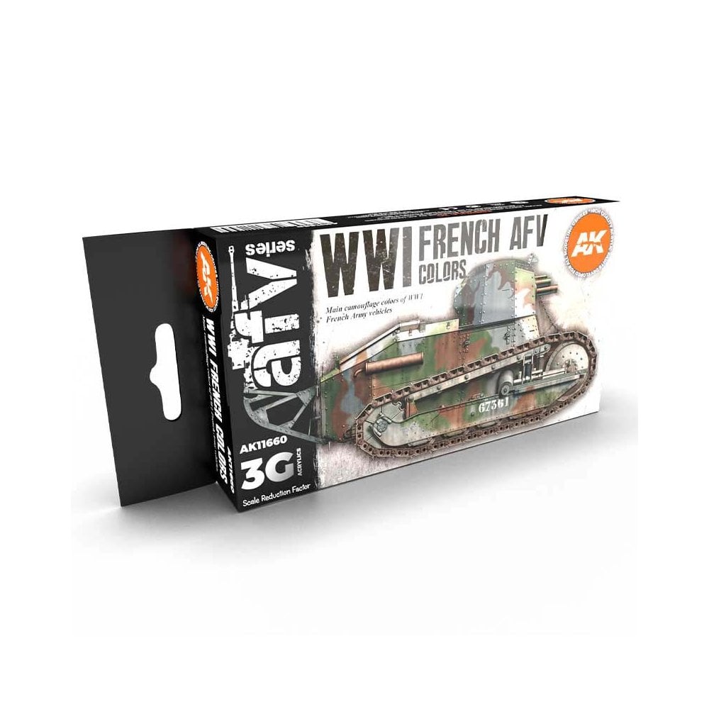 This 3rd Generation acrylic paint set offers the modeler the six colors essential for painting tanks and artillery pieces of the French Army during the Great War.With this set, the colorful camouflage schemes used on Renault FT and its variants, St. Chamond or Schneider tanks, can be replicated with accuracy.These colors are also perfect for US Army WWI tank units employing the FT-17 tank. This set contains:AK11302 WWI French Milky Coffee.AK11303 WWI French Artillery Grey.AK11162 WWI French Artillery Blue (Spectrum Blue).AK11304 WWI French Brown.AK11305 WWI French Green#1AK11306 WWI French Green#2.