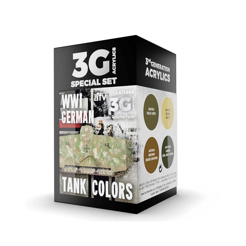 A special set of 3rd Generation acrylic paints including the four camouflage colors that were most commonly used for painting vehicles and artillery pieces of the German army during the Great War.It allows the modeler to accurately reproduce the colorful patterns seen on the German and captured equipment of the era. This set contains:AK11154 Field Grey.AK11031 Ochre (Buff).AK11109 Brown (Dark Brown).AK11308 Green (RAL 6007 Grn).