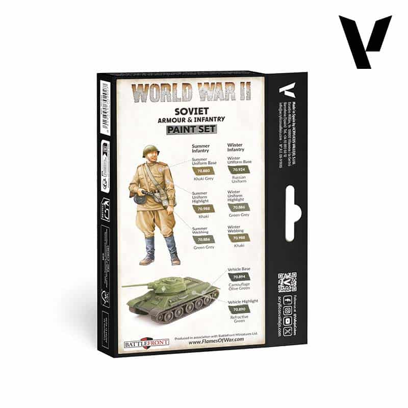 This set, in combination with the Utility Paint Set, contains the colors needed to paint uniforms and vehicles of the Soviet Army during WWII.