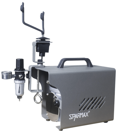 What makes the Sparmax Zeta compressor different is the Smart-Stop hanger and regulator/pressure gauge, which can be positioned on your worktop away from the compressor (using the clamp provided). This remote switch hanger is the first of its kind in the market and is internationally patented.